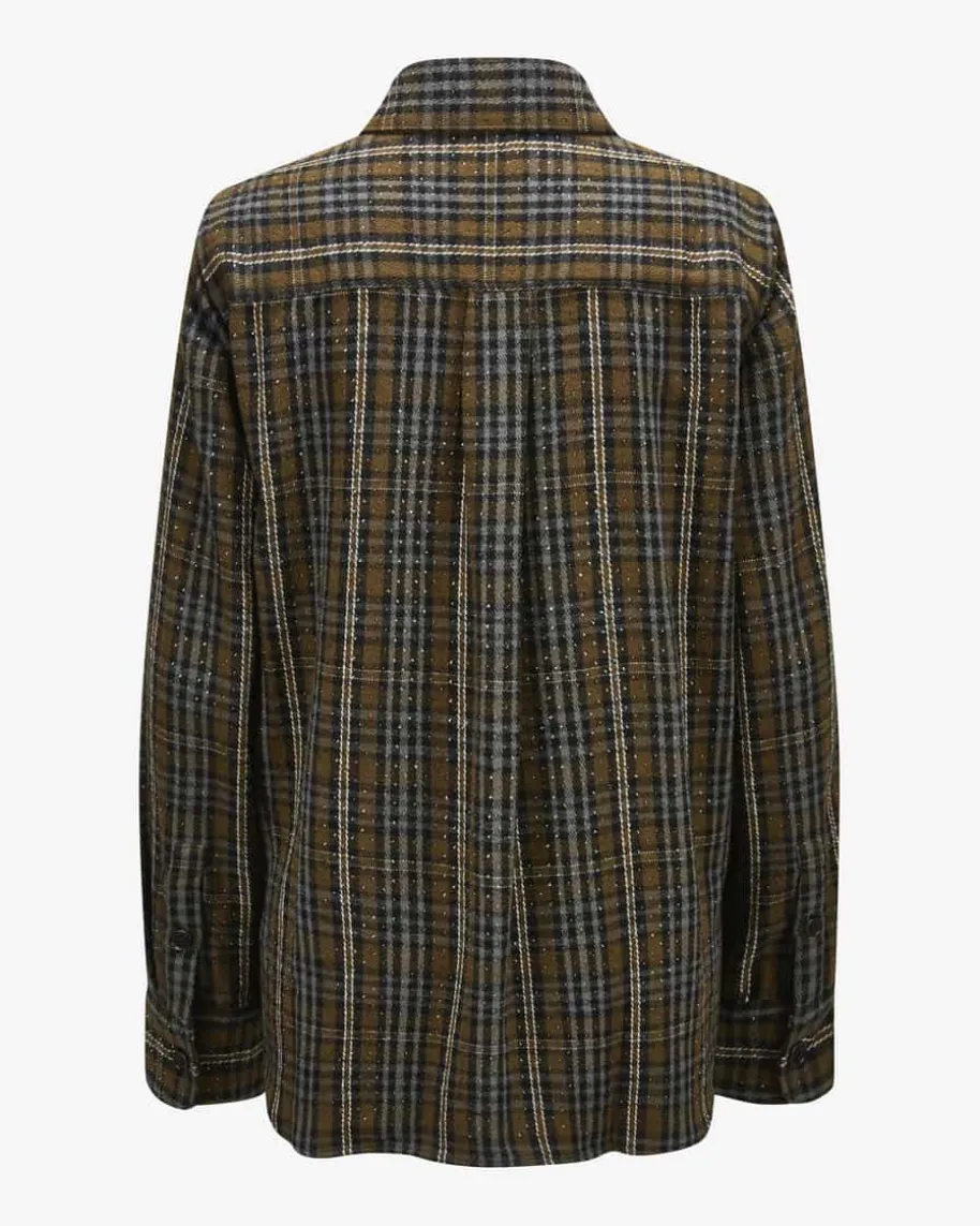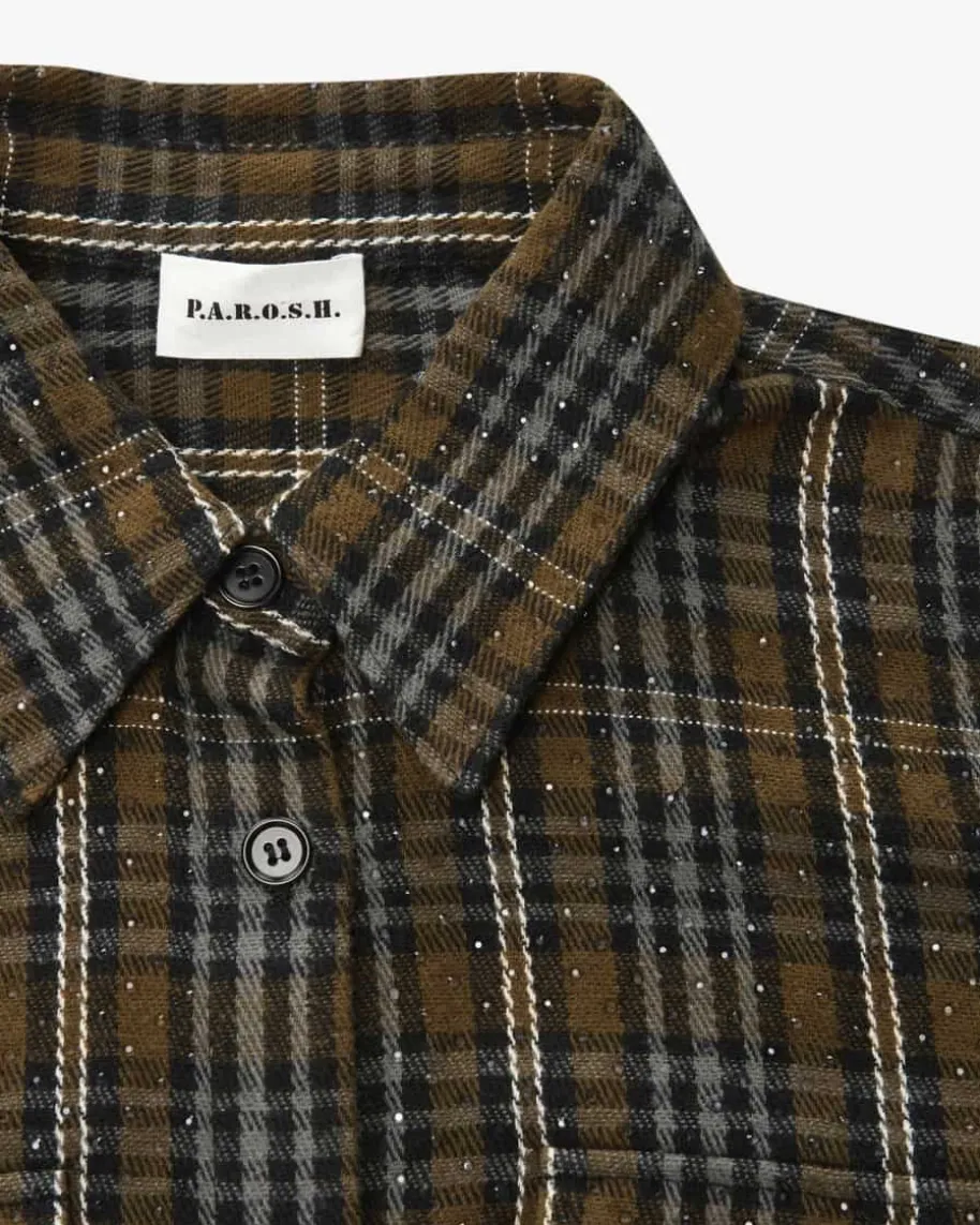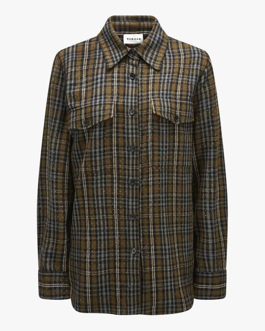 Core Flanellbluse für Damen von Parosh in Khaki, Dunkelblau und Grau. Steht fürverspielte Designs mit Vintage-Flair – farbenfrohe Prints, Glitzer und Retro-Vibes made in Italy. Auch dieses Modell überzeugt in hochwertiger Baumwoll-Qualität, während das Karo-Dessin und die Schmuckstein-Applikationen einen edlenBegleiter für vielseitige Styles kreieren.