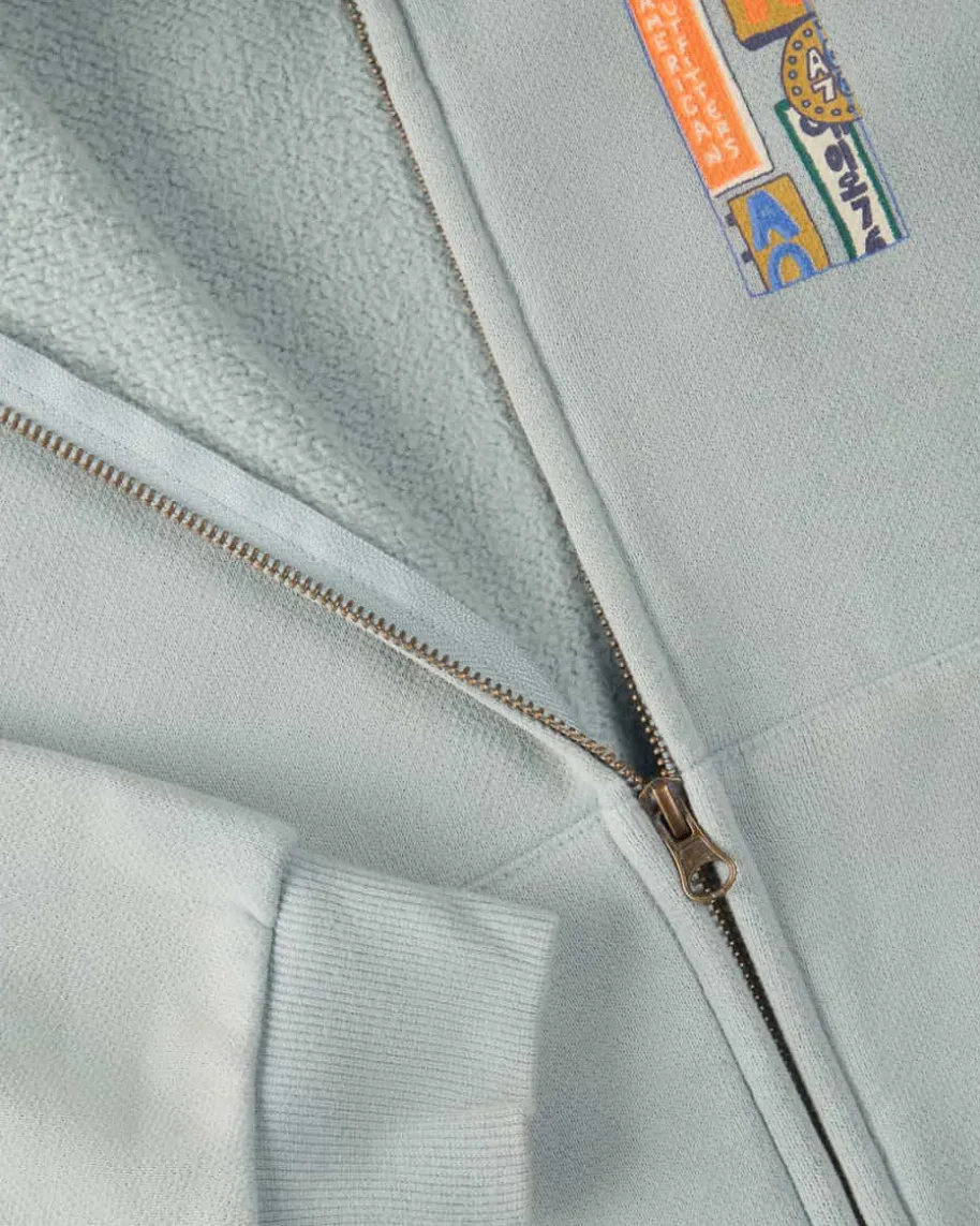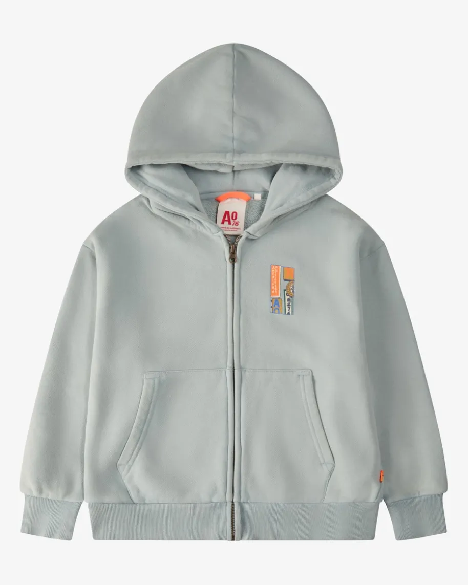 Cosy Sweatjacke für Jungen von AO76 in Salbei und Bunt. Das legere Modellbegeistert mit hochwertigem Baumwoll-Sweat und weicher Innenseite, während derrückseitige Skateboard-Print den modernen Style gekonnt abrundet.