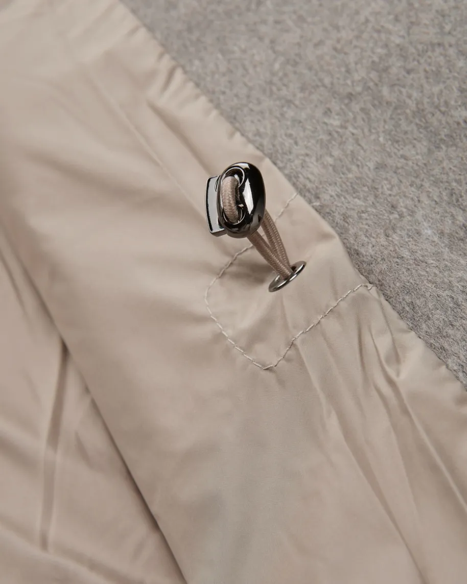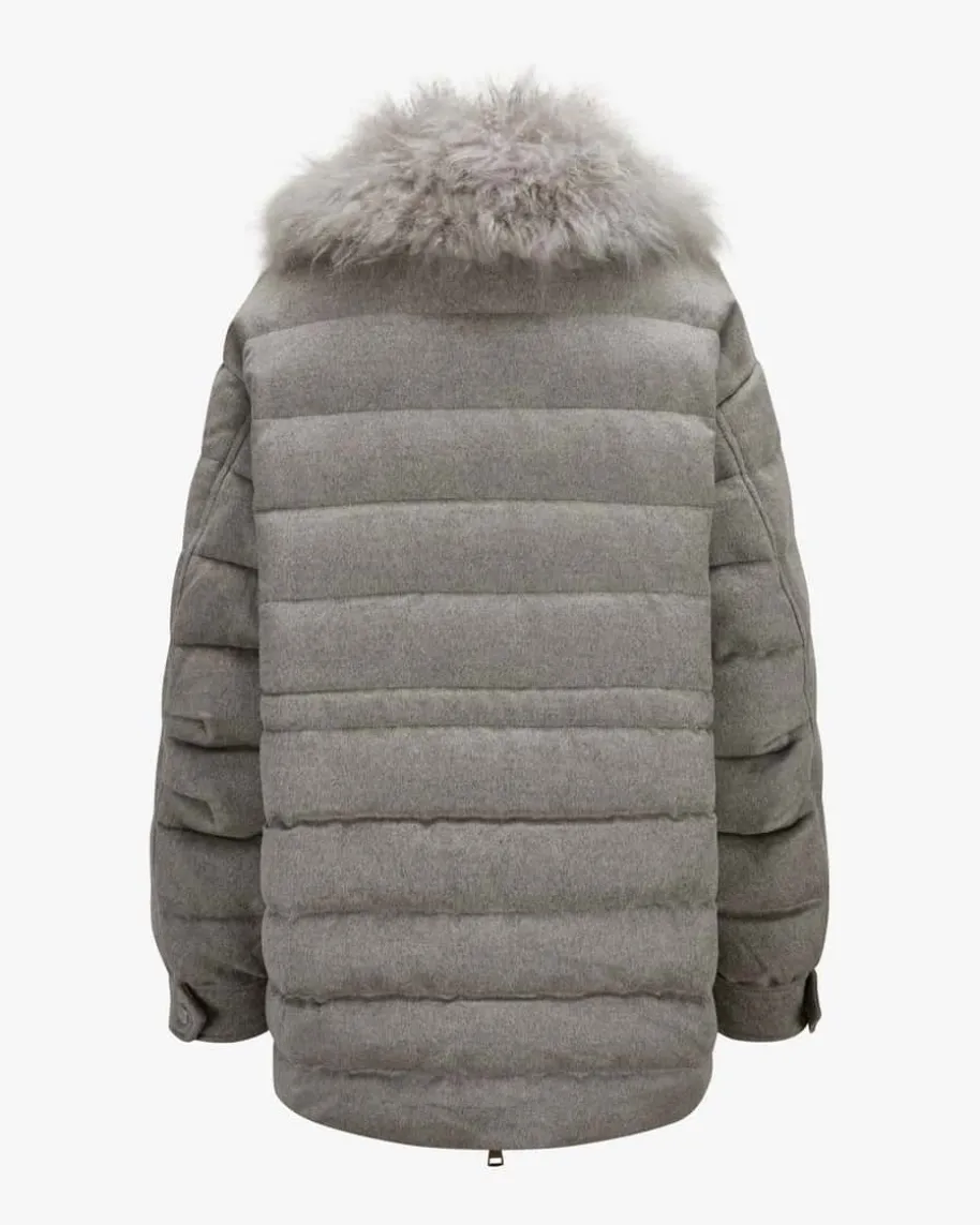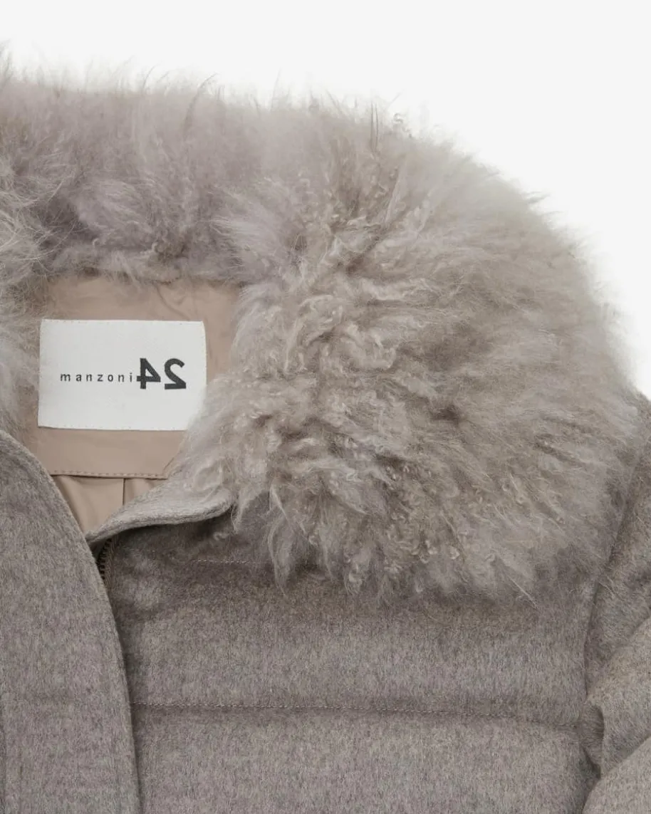 Daunenjacke für Damen von Manzoni 24 in Taupe. Das Modell avanciert dank desweichen Kragens mit Cashmere-Ziegenfell-Besatz zum hochwertigen Begleiter fürkühlere Tage, während die softe Haptik und die gesteppte Optik einen modischenFavoriten für feminine Winter-Looks schaffen.