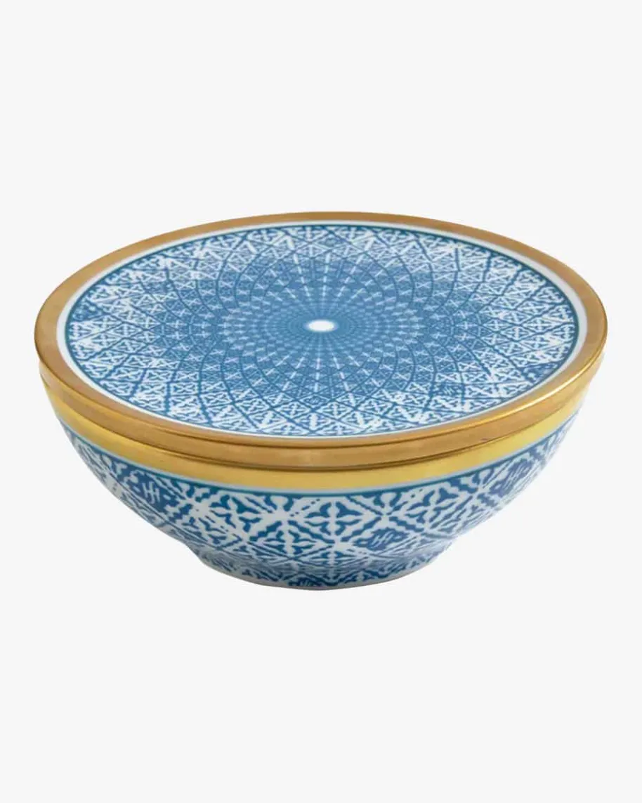 Deckel von Friendly Hunting in Royal, Weiß und Gold. Der Deckel im Eyes ofMarrakesh Print kann zur Schale Manu 0,22 l ergänzt oder separat als Tellerverwendet werden und ist eine Hommage an die typischen orientalischen Ornamenteder Wüstenmetropole Marrakesh.