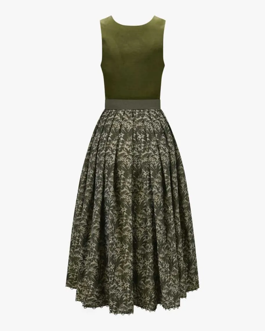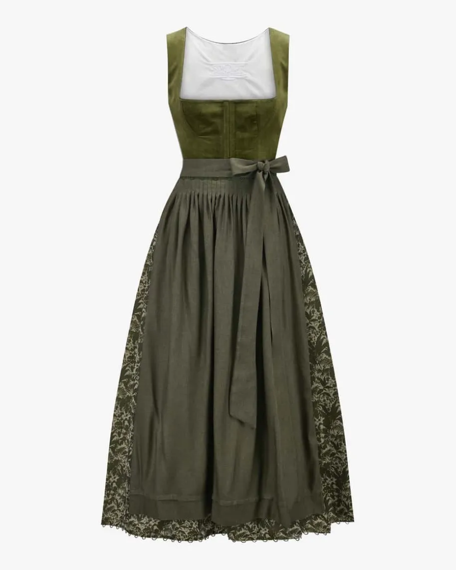 Dirndl lang mit Schürze für Damen von Sportalm in Oliv und Creme. Für dasösterreichische Modelabel stehen exklusive Designs sowie höchsteQualitätsstandards im Fokus. Auch dieses Modell punktet dank des hochwertigenJacquard-Rocks mit Blätter-Motiven in stilvoller Aufmachung, während das Miederin Samt-Optik den traditionellen Charakter modern untermalt. Zugleich vollendetdie softe Schürze mit Falten-Details den femininen Trachten-Look gekonnt.
