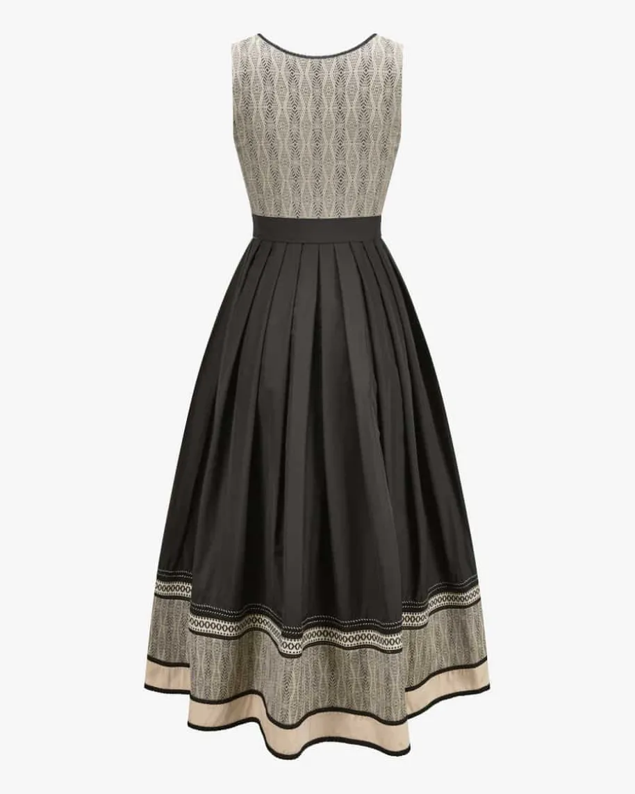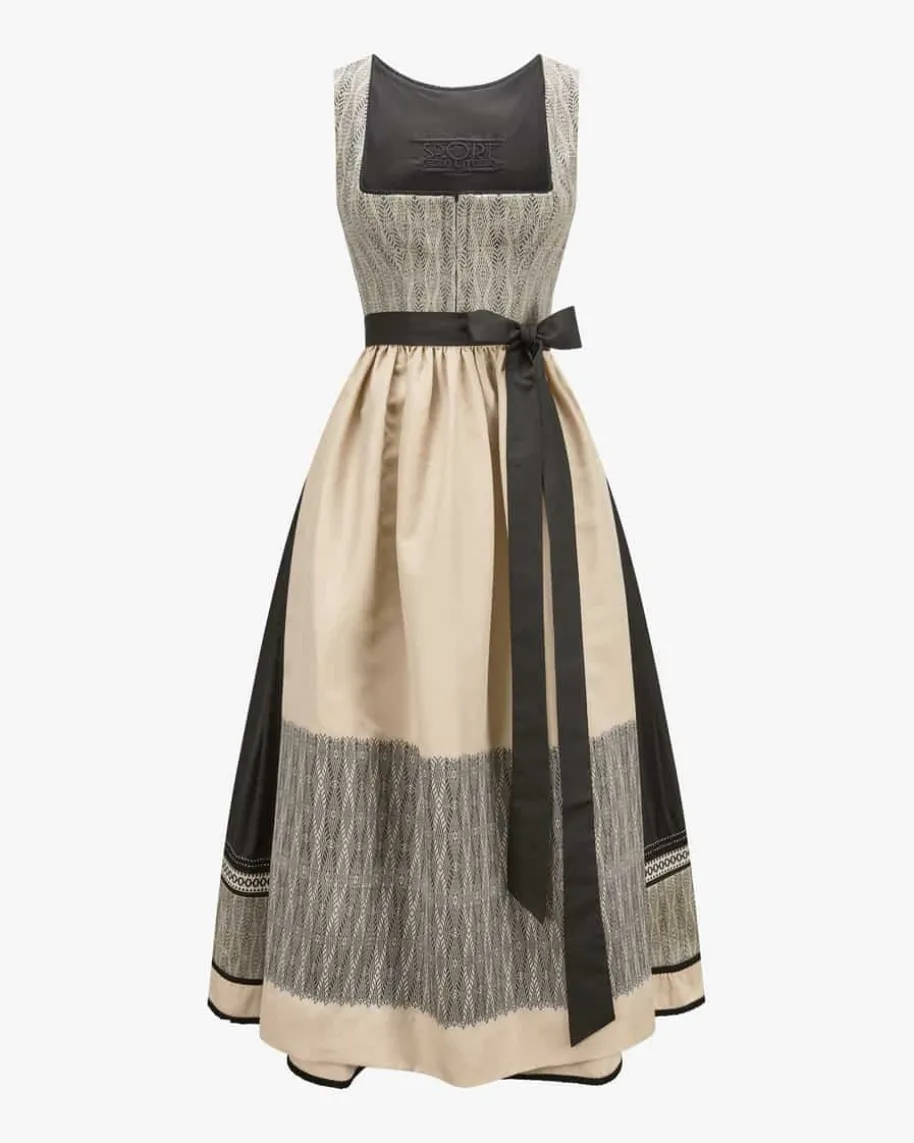 Dirndl lang mit Schürze für Damen von Sportalm in Schwarz und Sand. Dasraffinierte Webmuster mit feinen Glitzerfasern verleiht dem Modell eine feminineAusstrahlung und einen Hauch von Glamour. Hochwertige Verarbeitung unterstreichtden traditionellen Charakter mit Stil und Eleganz. Edle Borten am Rocksaumsetzen einen besonderen Akzent und runden den Trachten-Look harmonisch ab.