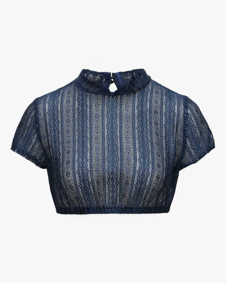 Dirndlbluse für Damen von Silk & Pearls in Dunkelblau. Das hochgeschlosseneModell begeistert mit semitransparenter Spitzen-Aufmachung und avanciert so zummodernen Trachtenbegleiter.
