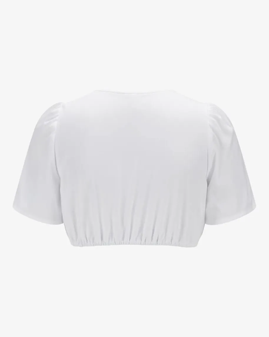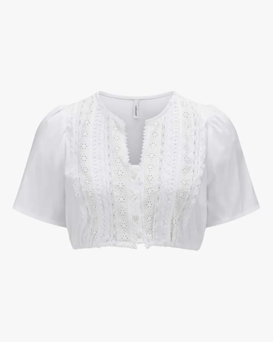 Dirndlbluse für Damen von Wallmann in Weiß. Dank der Kombination aussemitransparenter Spitze sowie dem raffinierten Lochmuster erhält das Modellromantische Akzente und avanciert so zum stilvollen Trachten-Begleiter. Zugleichverleihen die dezenten Puff-Ärmel sowie changierende Knöpfe dem Gesamtbild eineedle Note.