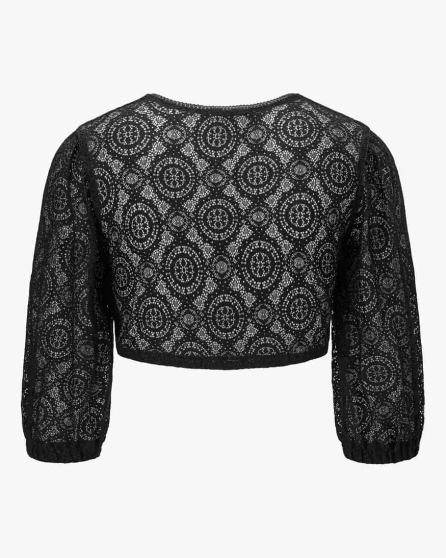 Dirndlbluse für Damen von LODENFREY München 1842 in Schwarz. Das Modellüberzeugt dank floralem Spitzen-Design in femininer Aufmachung, während diedezenten Puffärmel den Trachten-Look mit romantischer Note vollenden.