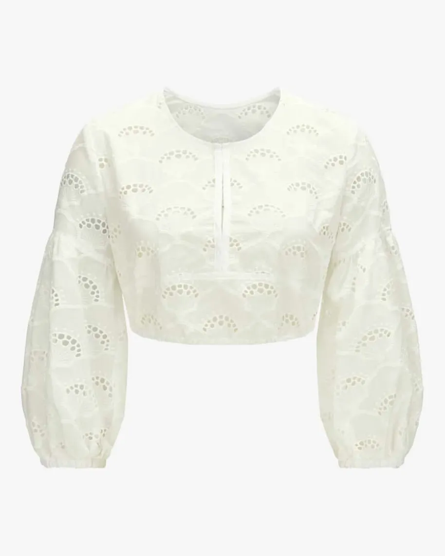 Dirndlbluse für Damen von Sportalm in Weiß. Dieser feminine Dirndl-Begleiterbesticht durch das semitransparente Lochspitzen-Design in charmanter Aufmachung,welche durch die raffinierten Ballonärmel stilvoll unterstrichen wird.