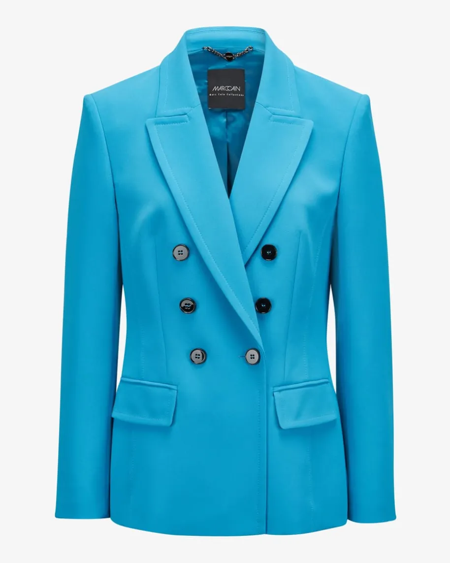 Doppelreiher-Blazer für Damen von Marc Cain in Türkis. Die Deutsche Marke stehtfür selbstbewusste, feminine Looks. Kombistarke Designs mit hohemQualitätsanspruch – bekannt für Prints & Strick. Auch dieses Modell überzeugtmit elastischem Crepe-Material und klassischen Details, während die taillierteSilhouette in modischer Signal-Farbe ein stilvolles Statement-Piece kreiert.