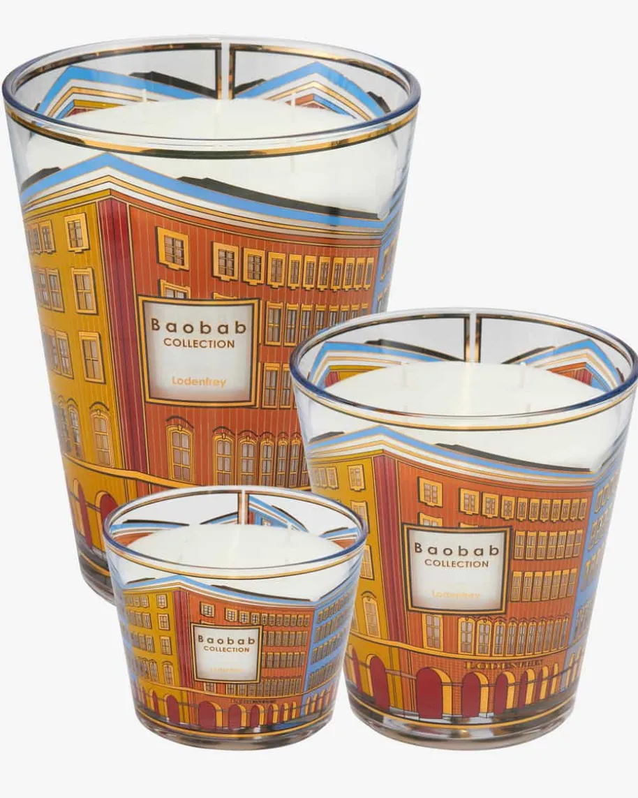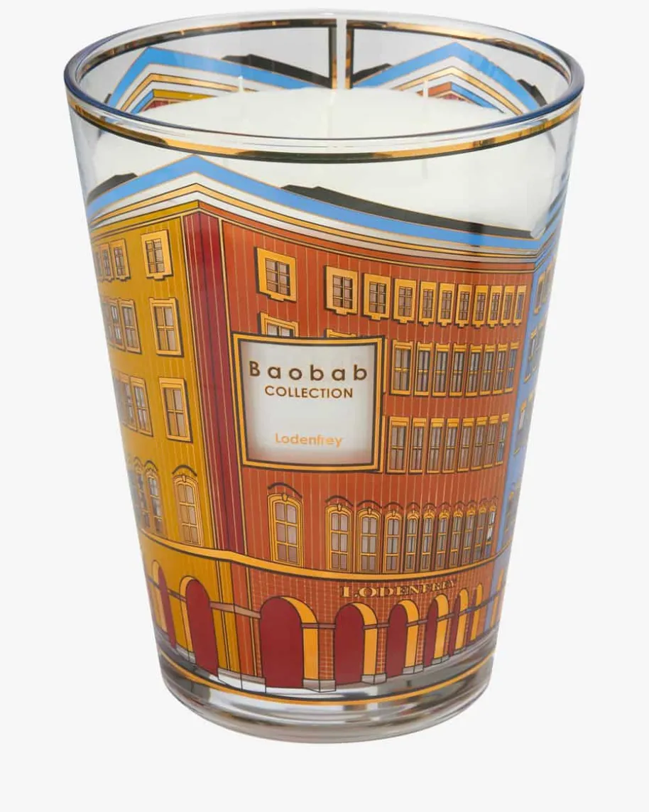 Duftkerze von Baobab. Diese Kerze der Limited Edition für Lodenfrey besticht mitihrenwunderbaren Holz und Jasmin Duftnoten. Sie ist ein kostbares Designobjekt, aufwelchem dasTraditionshaus Lodenfrey in einem Mix aus 6 Pantonefarben abgebildet ist und mitseinem exklusiven Design jedesWohnzimmer ziert. Hergestellt wurde die Kerze mit Hilfe eines aus Gold, Platinund Farben bestehenden Siebdrucks.