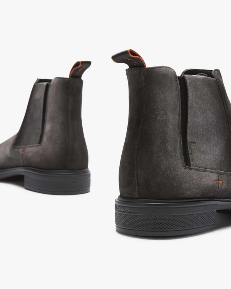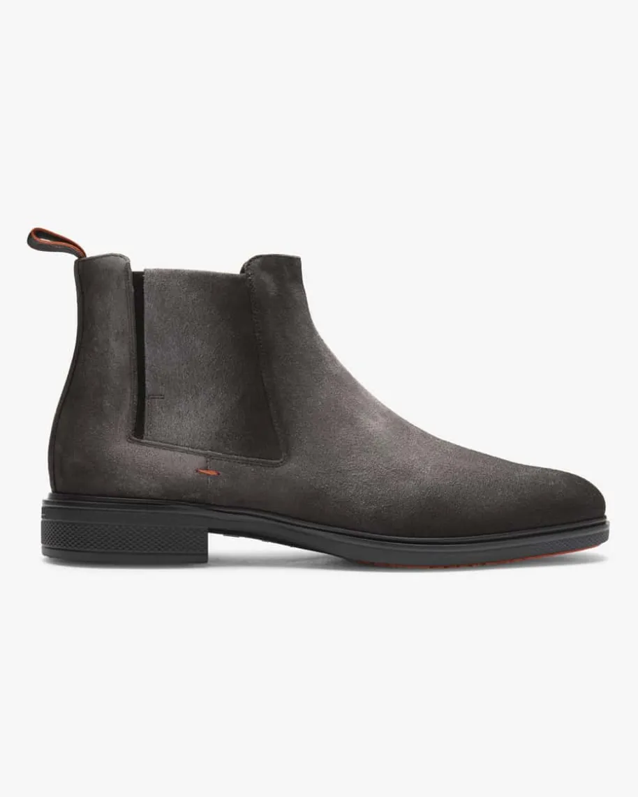 Easy Chelsea Boots für Herren von Santoni in Anthrazit. Höchste Handwerkskunstgepaart mit klassisch britischem Design – Auch dieses Modell überzeugt durch dieVerwendung von hochwertigem Veloursleder in eleganter Aufmachung, während diebesonders leichte Verarbeitung mit legerer Gummisohle einen hohen Tragekomfortverspricht.