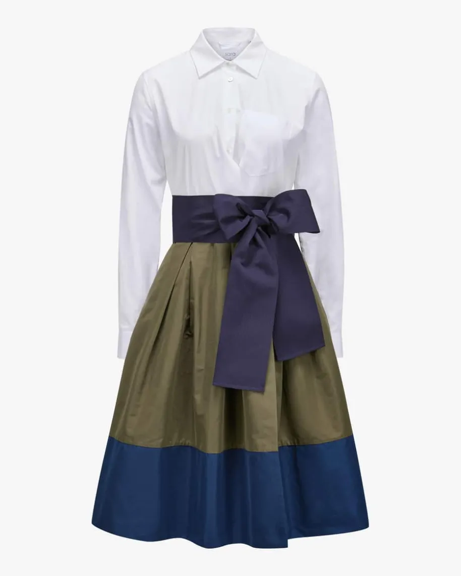 Elena Kleid für Damen von Sara Roka in Oliv, Weiß und Navy. Feminine Designs mitdem gewissen Etwas. Der Ursprung der Kollektionen findet sich im klassischenHerren-Hemd wieder, von dem die typischen Blusenkleider inspiriert sind. Auchdieses Modell präsentiert sich mit raffiniertem Material-Mix und klassischenHemd-Details. Das abnehmbare Taillenband zaubert eine feminine Silhouette undrundet den stilvollen Look gekonnt ab.