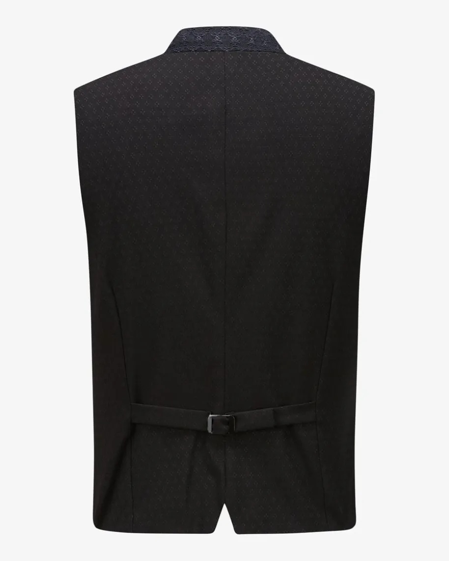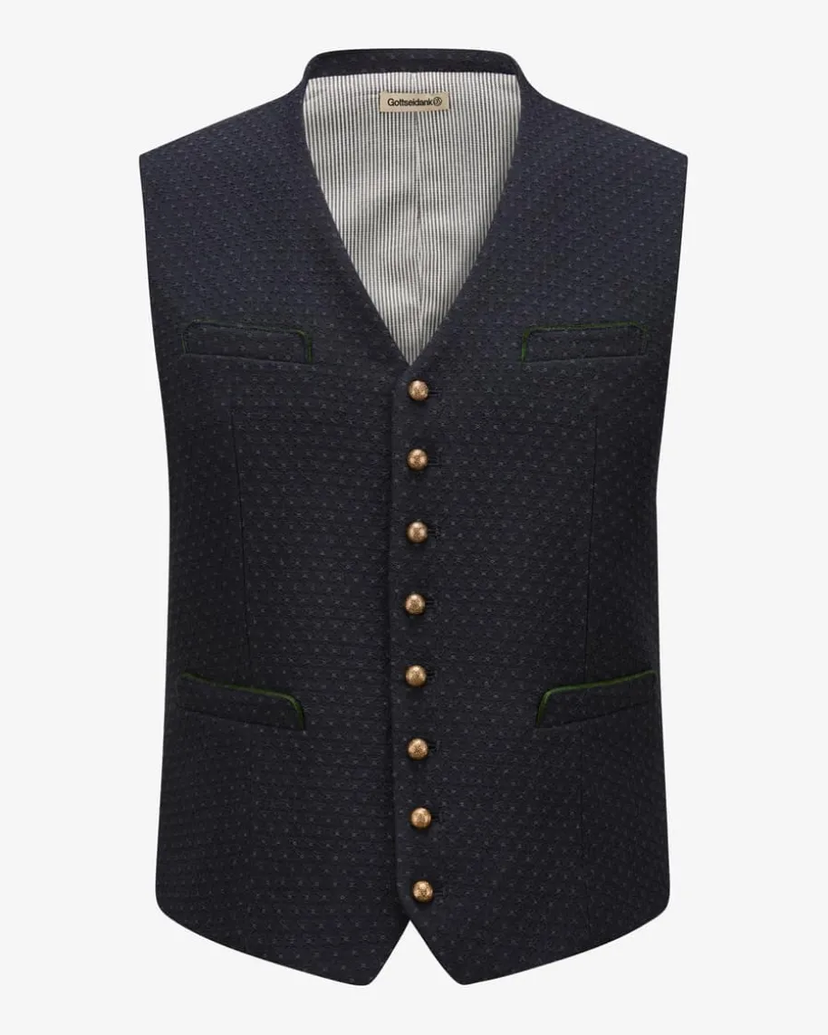 Elias Trachtenweste für Herren von Gottseidank in Navy und Schwarz. Das Modellbesticht mit strukturiertem Design und fein gemusterter Rückseite, während diefarblich abgesetzten Samt-Paspelierungen sowie die stilvoll verziertenKugelknöpfe dem traditionellen Look eine besondere Note verleihen.