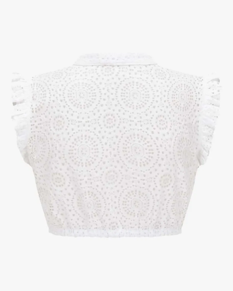 Emma Dirndlbluse für Damen von Kinga Mathe in Weiß. Das Modell überzeugt danksemi-transparenter Spitzen-Verarbeitung in femininer Aufmachung, während diedezenten Flügelärmel und der schmale Stehkragen den Trachten-Look mitromantischer Note vollenden.