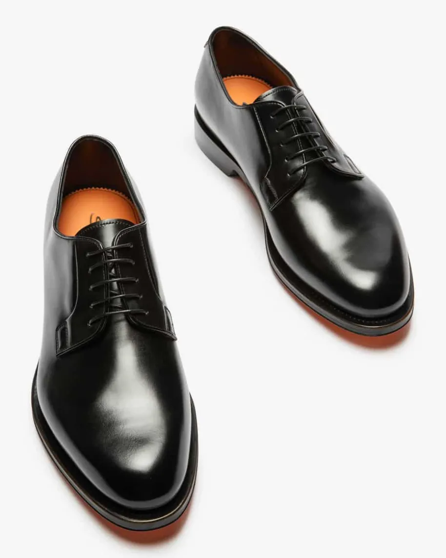 Ensley Derby-Schuhe für Herren von Santoni in Schwarz. Made in Italy – Der edelgefertigte Schuh präsentiert sich mit hochwertig verarbeitetem Glattleder. DieLedersohle ist teilweise genagelt, während die klassische Schnürung und eleganteZiernähte das Gesamtbild gekonnt abrunden.