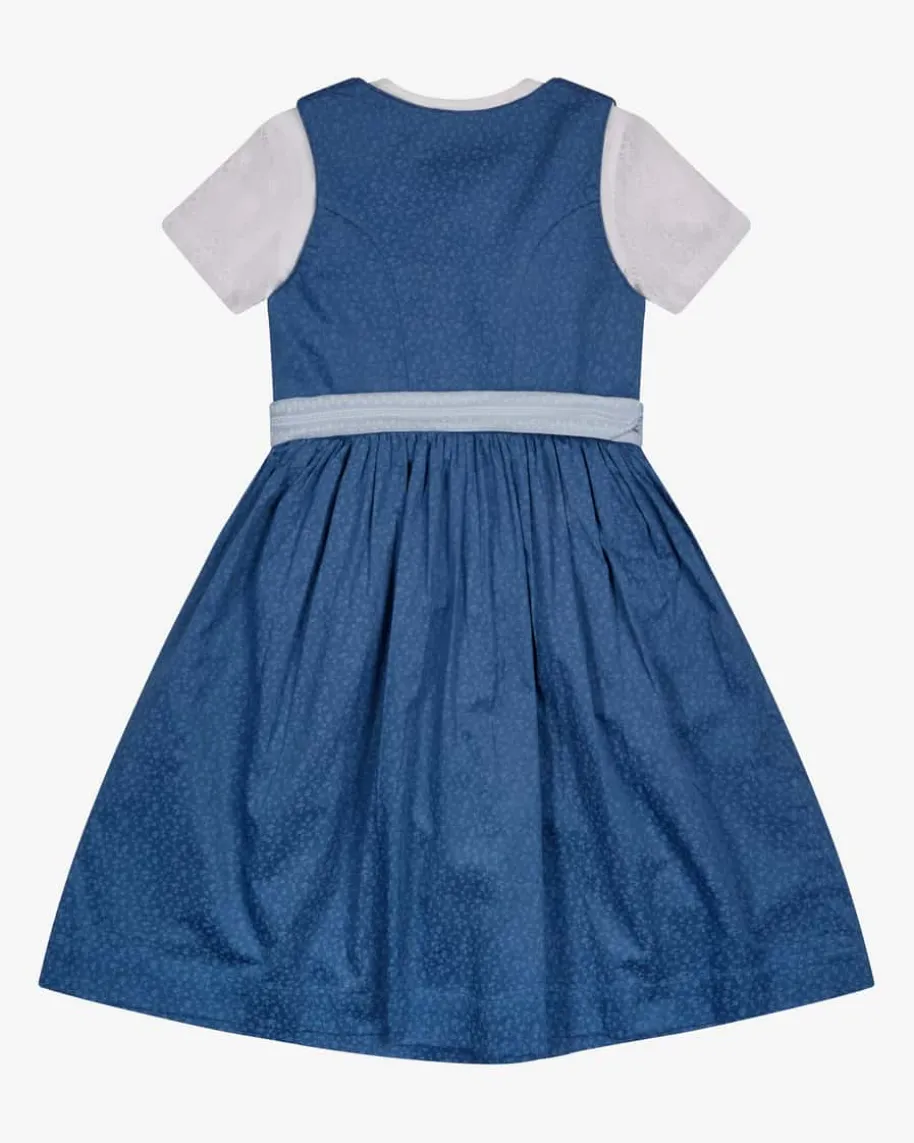 Erika Dirndl mit Bluse und Schürze für Mädchen von LODENFREY in Blau, Hellblauund Weiß. Dank der klassischen Schnittführung und dem dezenten Allover-Dessinist das Modell traditionell gehalten, während die Zierknöpfe und die floralgemusterte Schürze optische Highlights setzen.