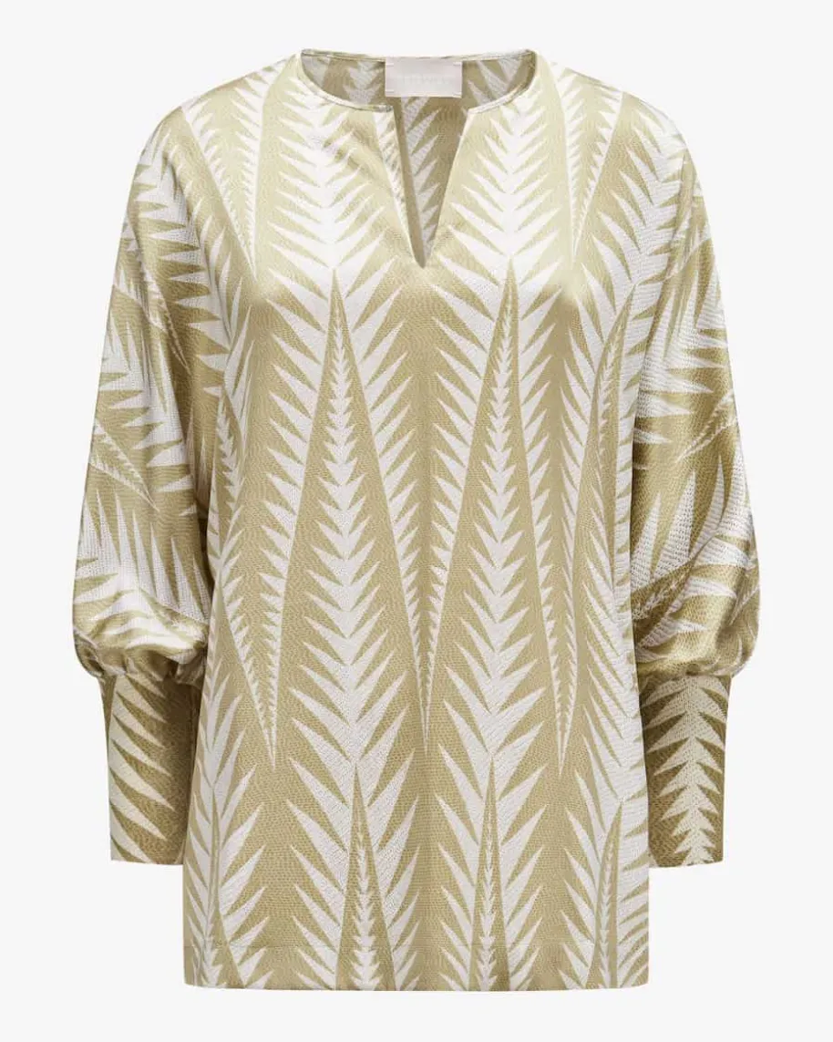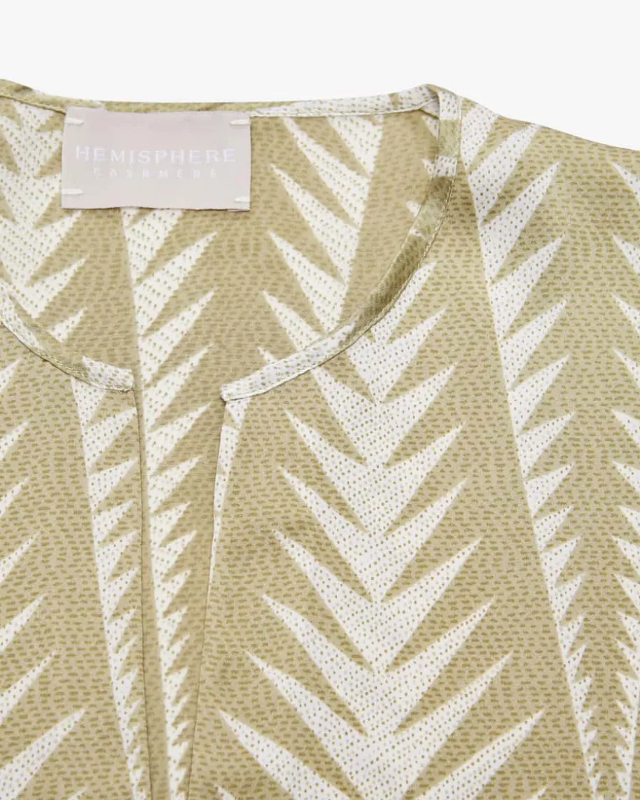 Farata Seiden-Tunika für Damen von Hemisphere in Khaki und Creme. Die deutscheMarke steht für luxuriöse Strick- und Kaschmirteile mit Fokus auf Qualität,Weichheit und zeitlose Farben. Auch dieses Modell avanciert dank der fließendenSeiden-Qualität zu einem besonderen Begleiter in moderner Schnittform, der sichvielseitig stylen lässt.