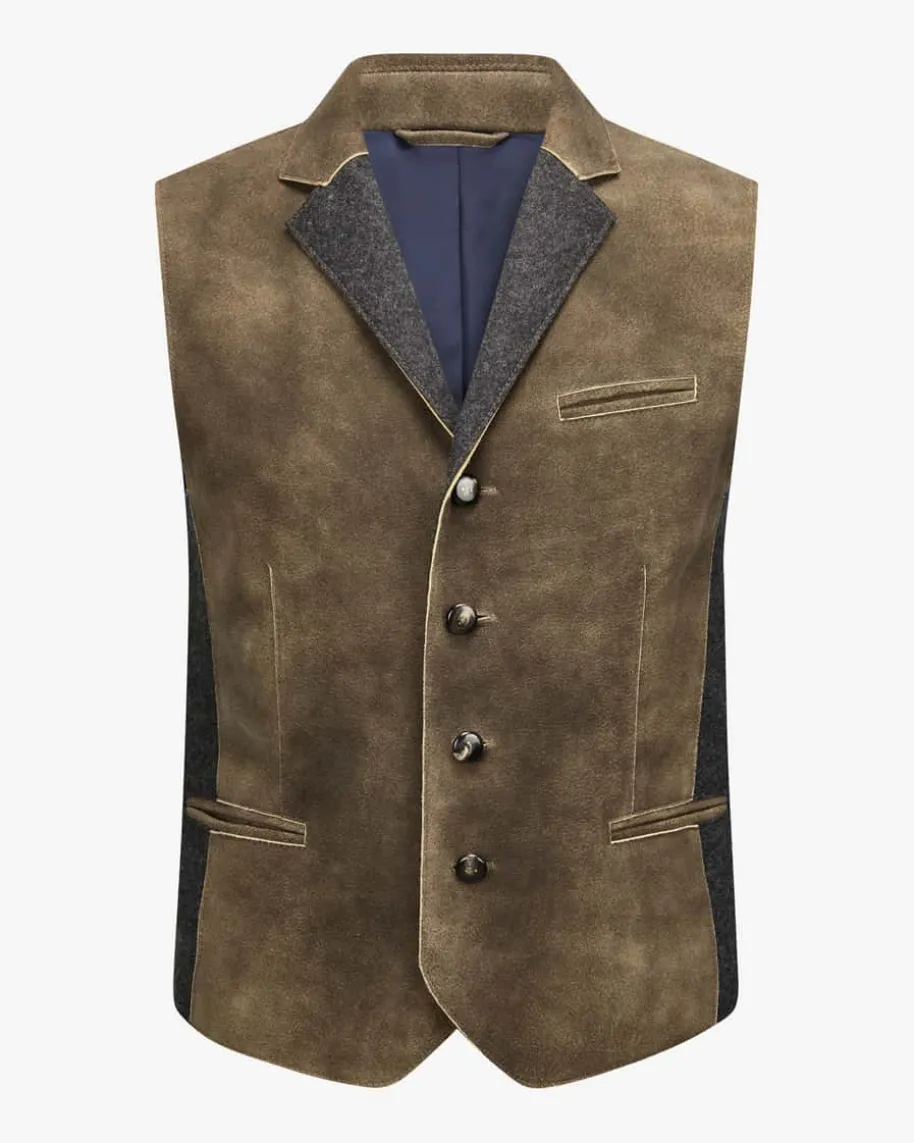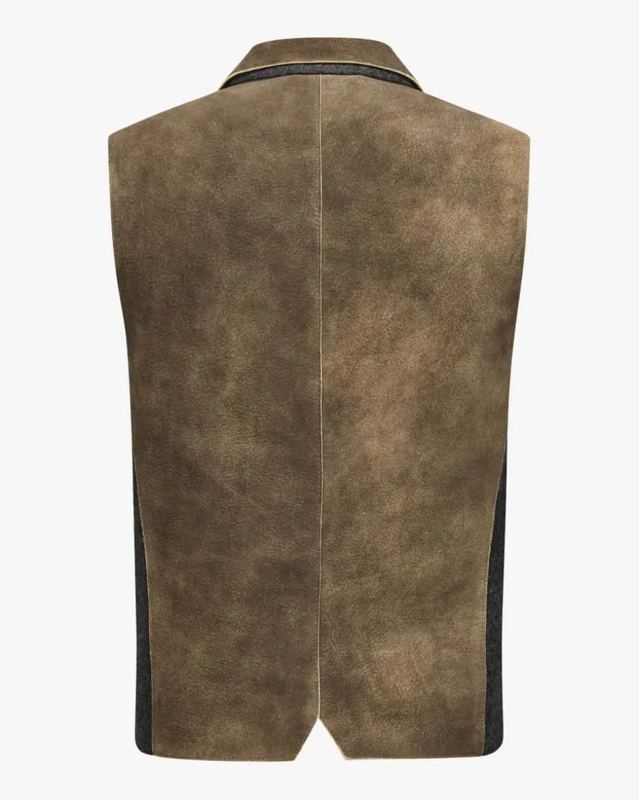 Floris Sämische Bergziege Trachten-Lederweste für Herren von Säckler in Braunund Anthrazit. Das Modell begeistert mit traditioneller Aufmachung, welche dankrobuster Büffelhorn-Knöpfe und weichem Hirschleder gekonnt unterstrichen wird.Einsätze aus Walkloden kreieren einen modischen Hingucker und ergänzen denTrachten-Look harmonisch.
