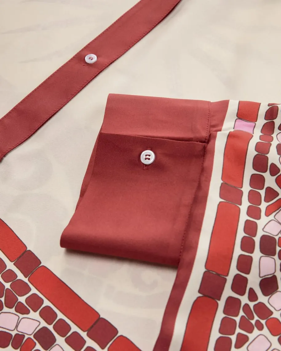 Foulard Seidenbluse für Damen von La DoubleJ in Rot, Creme und Rosa. Das Modellbegeistert mit extravagantem Foulard-Look und kreativem Mosaik-Print aufluxuriöser Seide. Die weite Oversize-Passform mit Blusen-Details und rundet denmodischen Sommer-Style harmonisch ab.