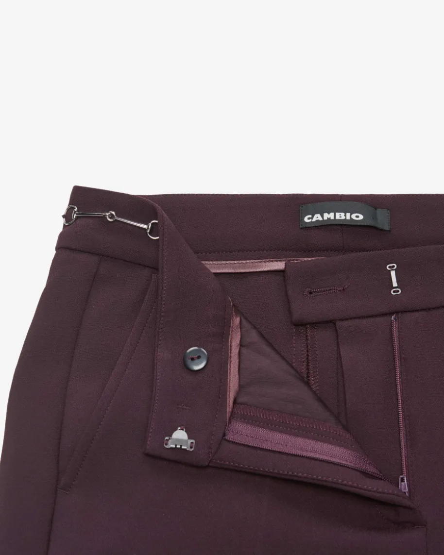 France 7/8-Hose für Damen von Cambio in Aubergine. Das verkürzte Modell mitausgestelltem Bein überzeugt dank dezent elastischer Material-Qualität mitangenehmen Tragemomenten und perfektem Sitz, während die silberfarbenenHorsebit-Details einen besonderen Akzent hinzufügen.