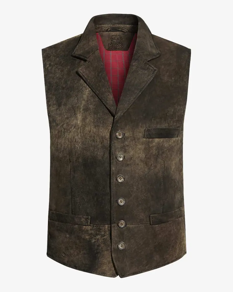 Gaucho Trachten-Lederweste für Herren von Meindl in Braun. Für die traditionelle Optik wurde für diese Trachtenweste ein charakteristisch gegerbtes Leder gewählt. Knöpfe in Hirschhorn-Optik, ein Reverskragen und die drei Stecktaschen unterstreichen die stilechte Optik. Auf der Innenseite verleiht ein kontrastfarbiges Karo-Futter der Weste den letzten Schliff.