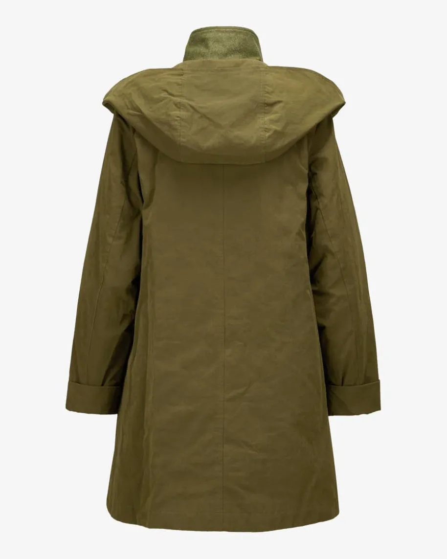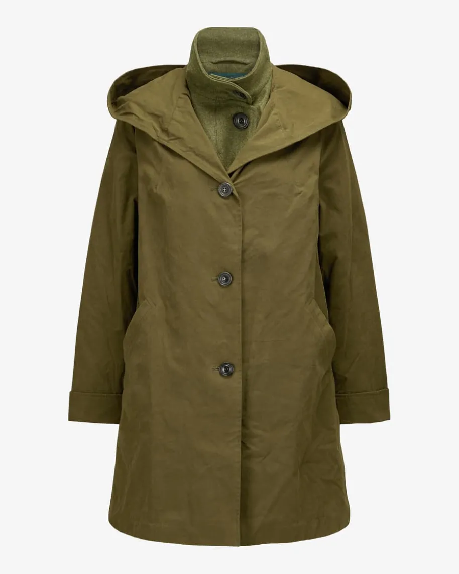 Genua Trachtenmantel für Damen von Münchner Lodenfabrik in Oliv. Das Modellüberzeugt durch die feste Stoff-Qualität und den integrierten Stehkragen mitdurchgehender Knopfleiste als zeitloser Trachtenbegleiter.