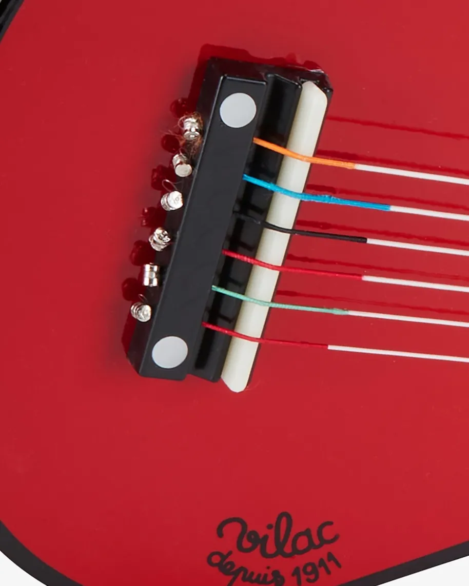 Gitarre für Kinder von Vilac in Rot und Schwarz. Für die ersten Akkordübungen –Diese kleine hochwertige Gitarre aus Holz überzeugt nicht nur durch denstylischen Look, sondern bringt auch echte Töne hervor. Mit seinen sechs einzelnstimmbaren Saiten, dem Schalloch sowie dem Griffbrett wird Ihr Kind zum nächstenMusik-Star.