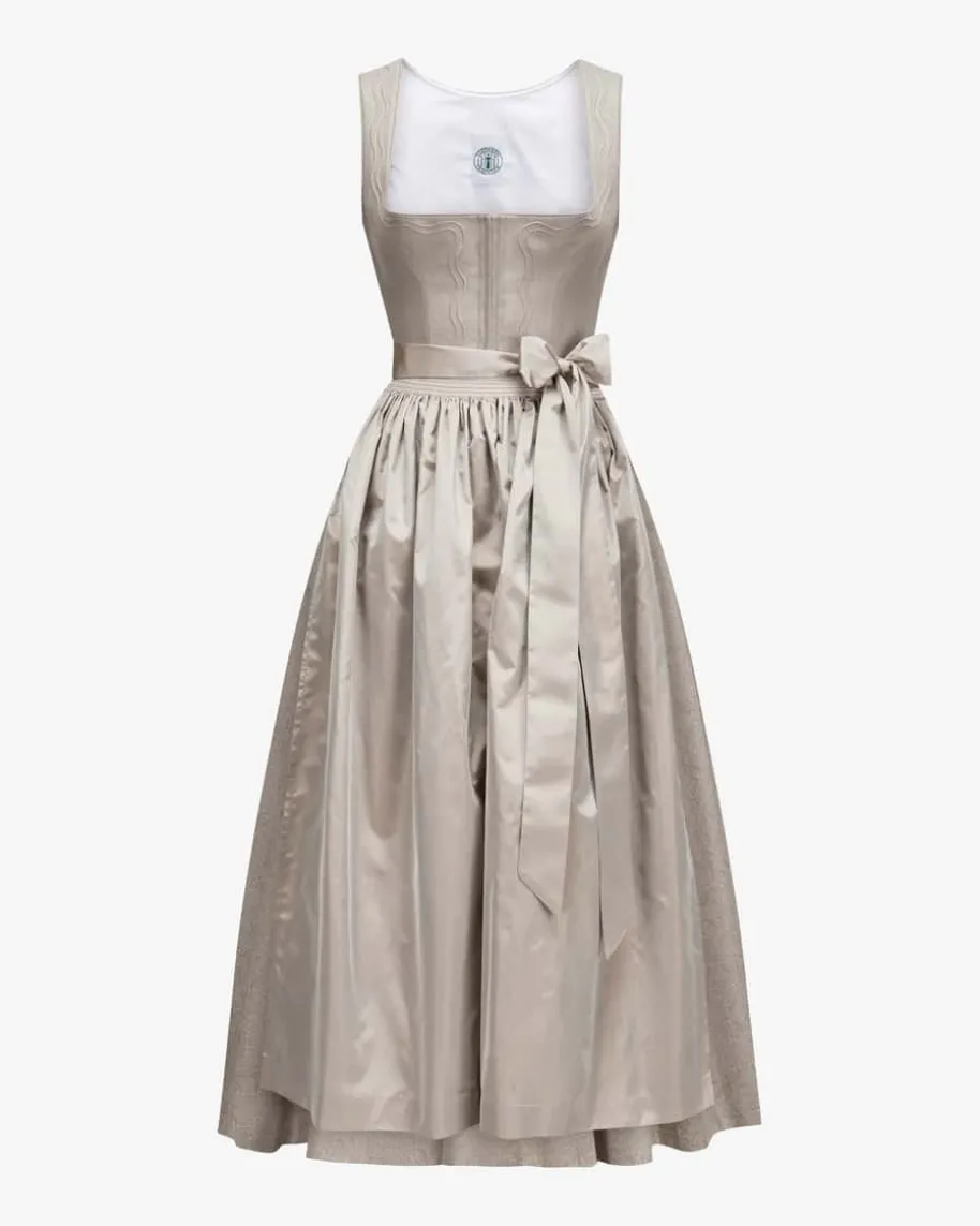 Grace Dirndl lang mit Seidenschürze für Damen von Tostmann in Taupe.Österreichische Traditionsmarke mit eigener Manufaktur – authentisch, zeitlos,hochwertig. Auch dieses Modell besticht mit Mieder in Leinen-Aufmachung, währendder Rock in abstraktem Dessin und die changierende Seidenschürze dentraditionellen Look gekonnt ergänzen.