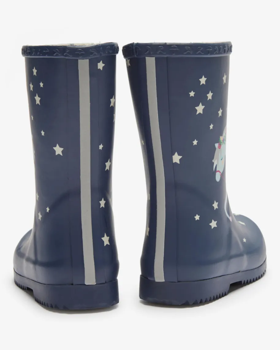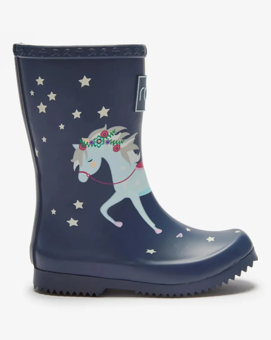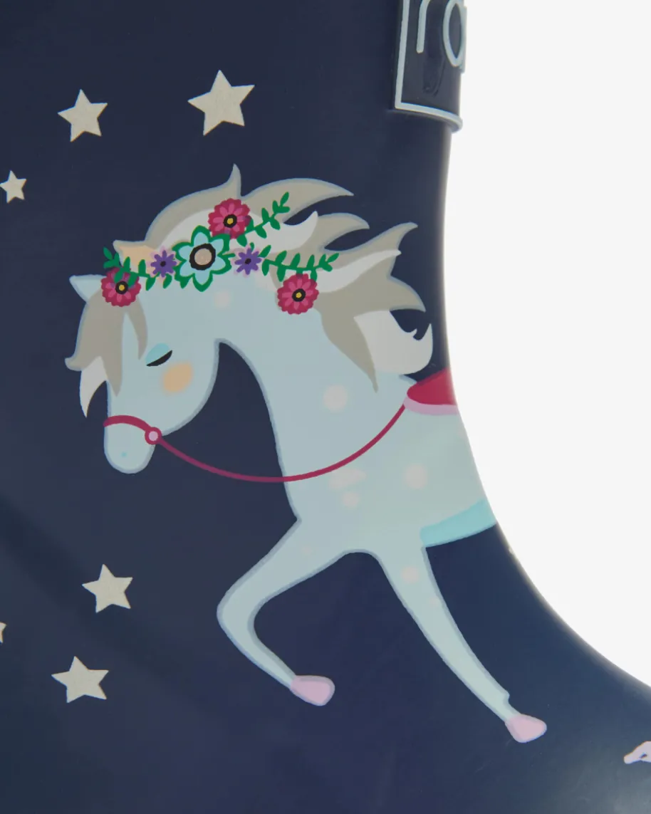 Gummistiefel für Mädchen von Rajn in Navy, Hellblau und Pink. Ein funktionalerBegleiter mit niedlichem Charakter – Dieses Modell wappnet Ihr Kleines optimalvor Kälte und Nässe, während das verspielte Pferde-Motiv im Sterne-Himmel süßeAkzente setzt.