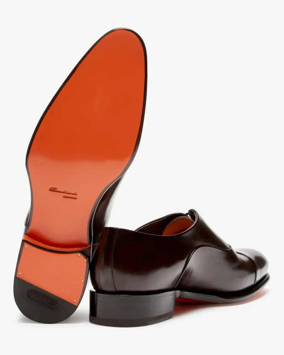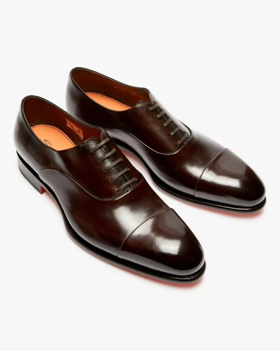 Halbschuhe für Herren von Santoni in Dunkelbraun. Made in Italy – Der edlehandgefertigte Schuh präsentiert sich mit hochwertig verarbeitetem Glattleder,während die klassische Schnürung und elegante Ziernähte das Gesamtbild gekonntabrunden.