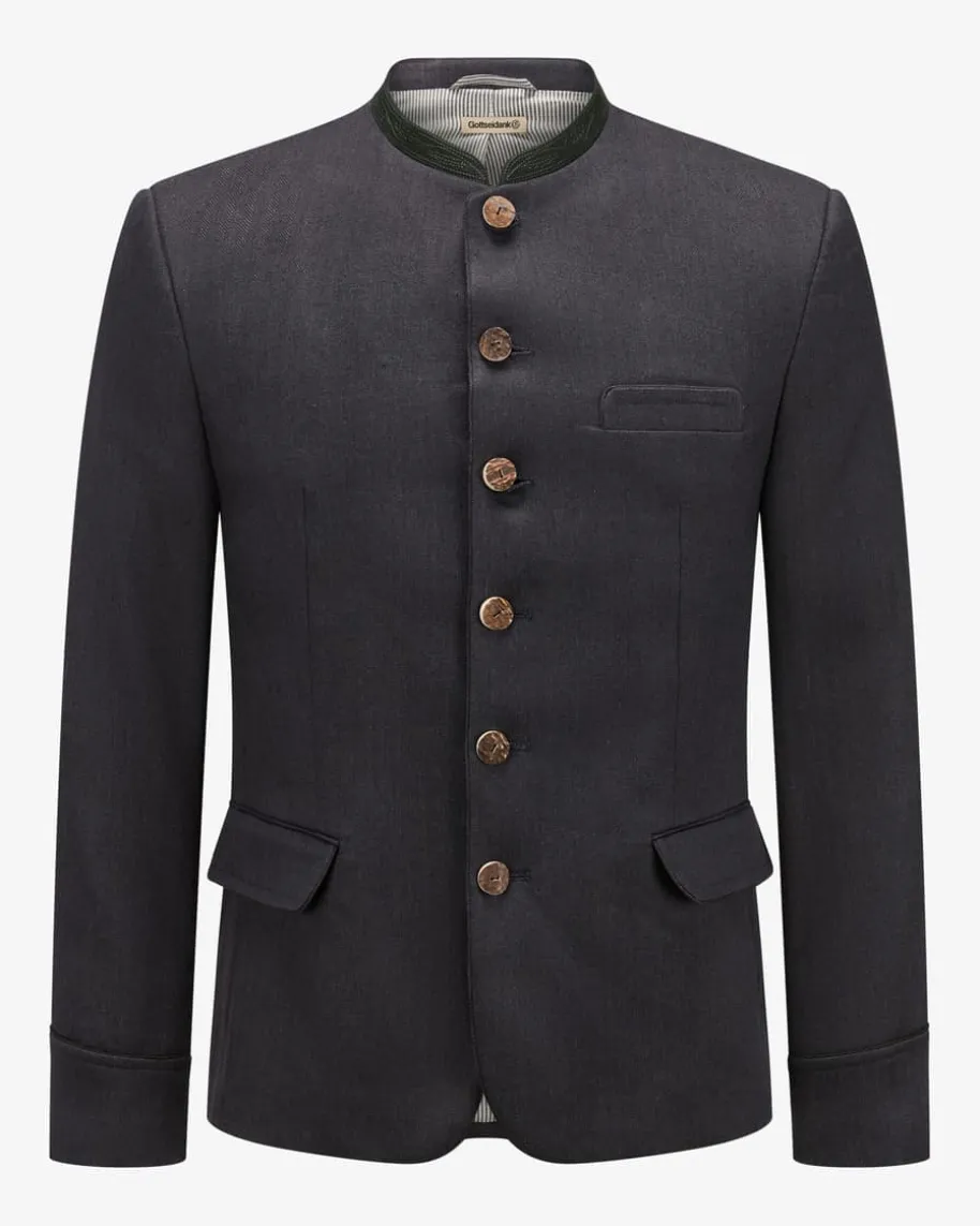 Helmut Trachtenjanker für Herren von Gottseidank in Nachtblau und Dunkelgrün.Das Modell überzeugt durch den hochwertigen Leinen-Baumwoll-Mix zusammenmit eleganten Paspelierungen in traditioneller Aufmachung, während rustikaleHornknöpfe und der rückseitige Riegel das stilvolle Trachten-Design gekonntabrunden.