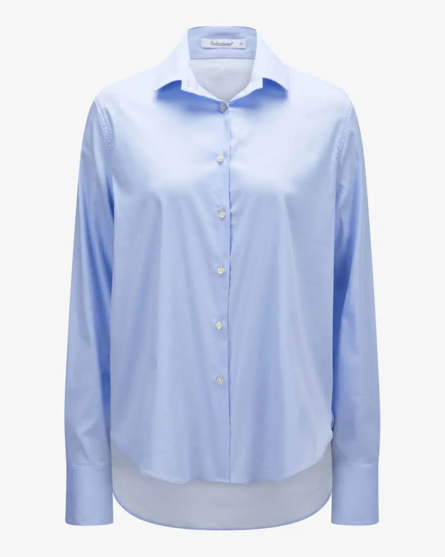 Hemdbluse für Damen von Soluzione in Hellblau. Dieses klassische Modellüberzeugt mit angenehmer Material-Qualität und zeitlosem Design. Die markantenManschetten verleihen zudem das gewisse Etwas, während die Knöpfe in Perlmutt-Optik das Gesamtbild harmonisch vollenden.