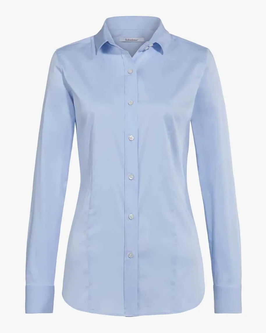 Hemdbluse für Damen von Soluzione in Hellblau. Das Modell überzeugt durchAbnäher mit einer taillierten und femininen Silhouette. Dank hochwertigemMaterialmix wird eine optimale Passform und hoher Tragekomfort garantiert,während der Hemdkragen klassische Akzente setzt. Modische Details wie dieEinknopf-Manschetten und der abgerundete Saum harmonieren perfekt mit dereingenähten Zierfalte auf der Rückseite und vollenden den stilvollen Look derBluse. Besonderes Highlight ist die verstärkte Knopfleiste, durch die mehrStand gewährt wird, wenn das Modell offen getragen wird.