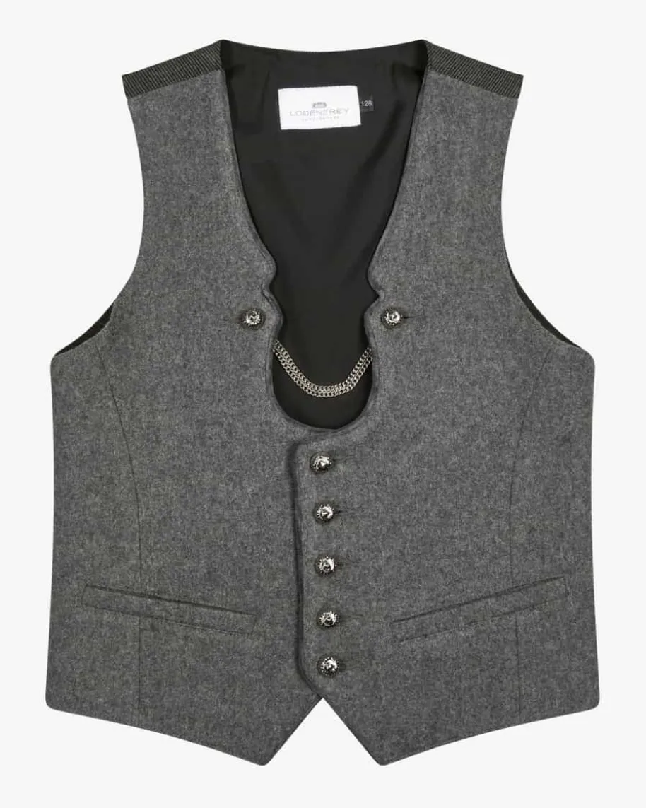 Henri Trachtenweste für Jungen von Hammerschmid in Dunkelgrau. Dank klassischerDetails sowie des Miesbacher Ausschnitts überzeugt das Modell in traditionellerAufmachung, während das Allover-Dessin dem Gesamtbild den letzten Schliffverleiht.