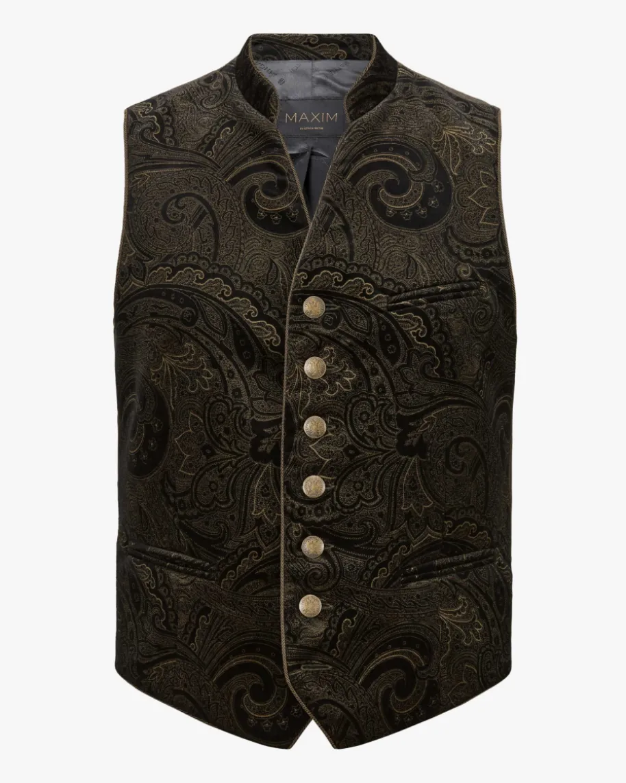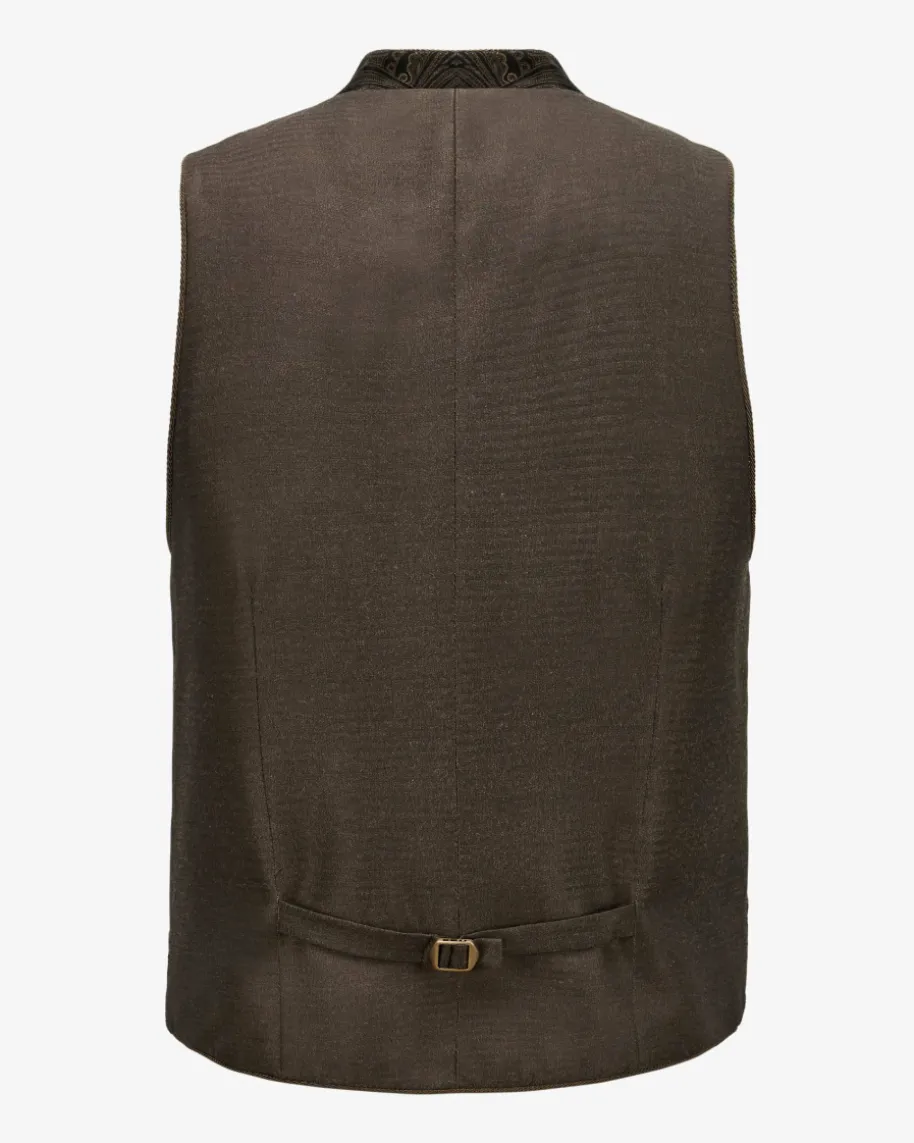 Henry Trachtenweste für Herren von Kinga Mathe in Schwarz und Beige. Dasexklusive Modell besticht mit traditionellen Details, welche dank goldfarbenerMünzknöpfe mit Wappen-Prägung sowie dem Material-Mix mit weicher Fischgrät-Struktur und ornamentalem Samt-Muster edel zur Geltung gebracht werden. Zugleichergänzen feine Kordel-Paspelierungen den Trachten-Look harmonisch.