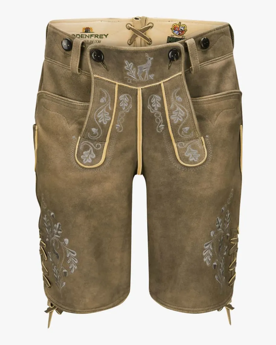 Herzog Albrecht Trachten-Lederhose kurz für Herren vonMeindlin Old Grey.Lederhandwerk aus Bayern – Bereits 1693 wurden bei Meindldie ersten Produkteaus Leder gefertigt und seit nun mehr als 70 Jahren fertigtdas Traditionshaushochwertige Lederhosen, die von Kennern meist ein Leben langgeschätzt werden.Dank jahrelanger Erfahrung und einer stetig-hochwertigenQualität ist Meindl zumgrößten lederverarbeitenden Betrieb in Deutschland undÖsterreich geworden. Auchdieses Modell aus sämisch gegerbtem Ziegenleder spiegeltdies gekonntwieder und begeistertmit floralen Details.