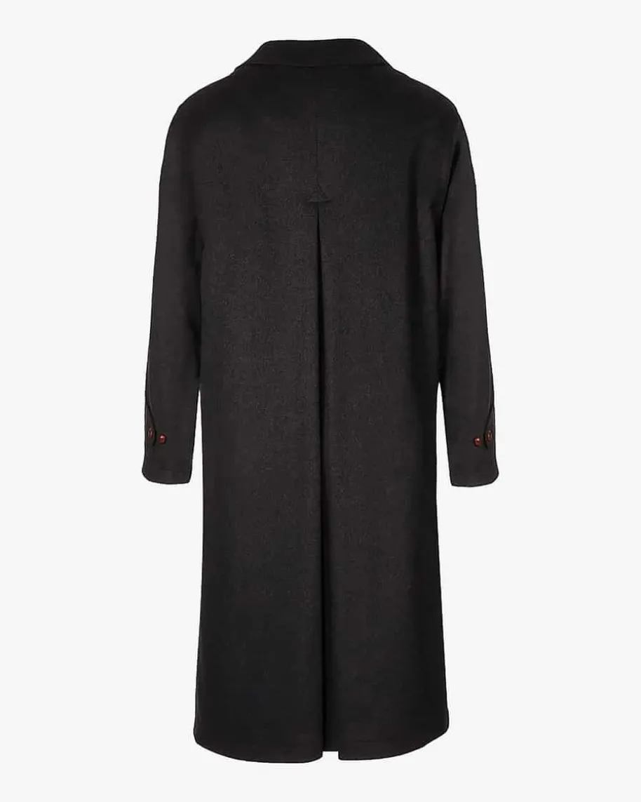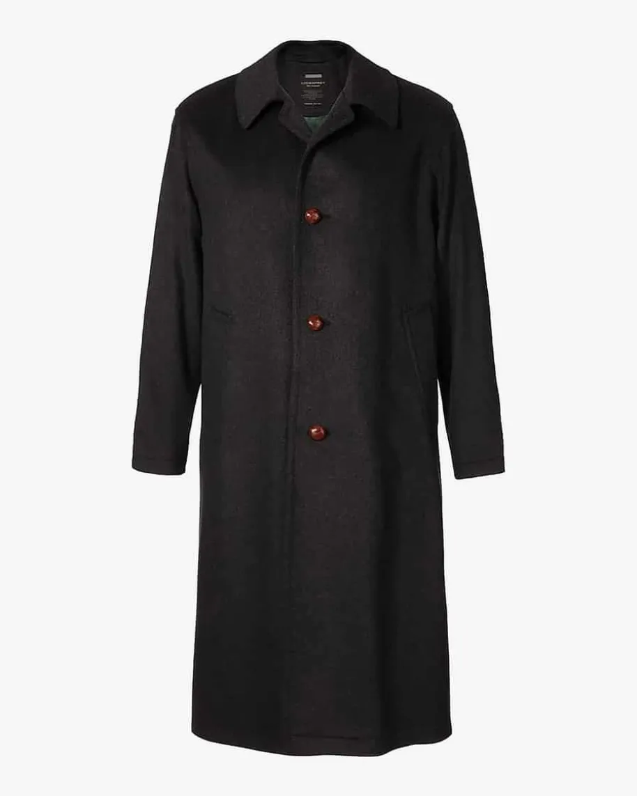 Klassisch geschnittener Lodenmantel von Lodenfrey aus Schurwolle und Cashmere in Grau. Mit Hubertusfalte, zwei Eingriffstaschen und Lederknöpfen in Braun.
