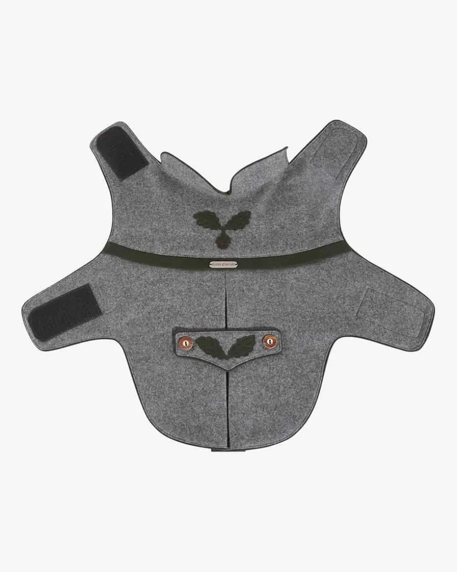 Hunde-Janker von Franzi Couture in Hellgrau und Mossgrün. Hundemode nach Maß -Das traditionelle Modell aus bayerischem, in Bayern gefertigtem Loden eignetsich perfekt für einen Ausflug auf das weltbekannte Oktoberfest. Mitkontrastierenden Paspeln sowie farblich passender Innenseite setzt der Jankermodische Akzente, während dezente Eichblatt Applikationen das Design rustikalvollenden.