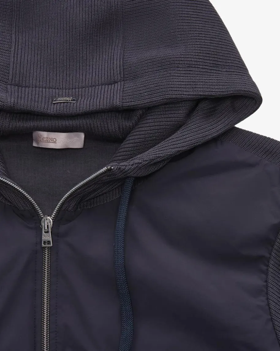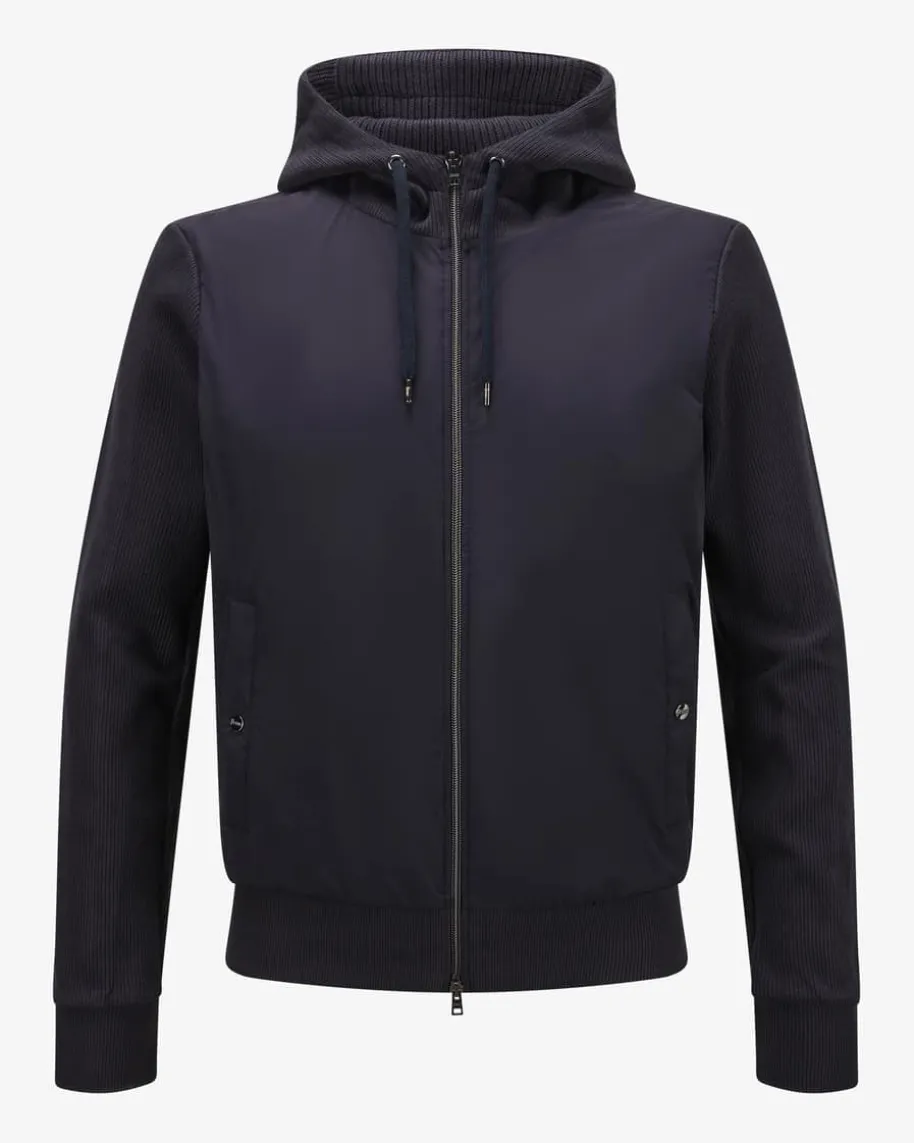 Hybrid-Strickblouson für Herren von Herno in Navy. Das maskuline Modellüberzeugt mit raffiniertem Material-Mix aus Baumwoll-Rippstrick und leichtwattierter Vorderseite. Die Blouson-Aufmachung mit Kapuze schafft einensportiven Begleiter für legere Outdoor-Looks.