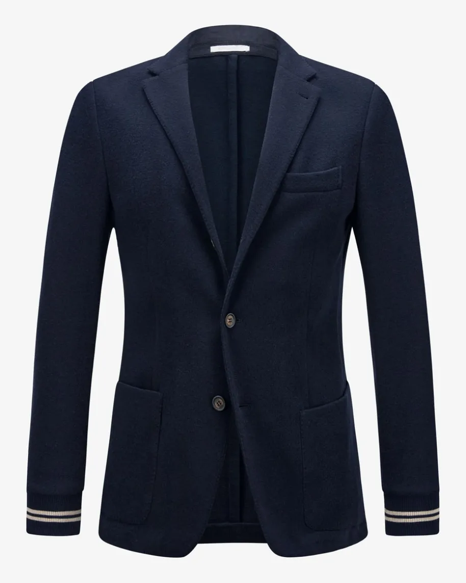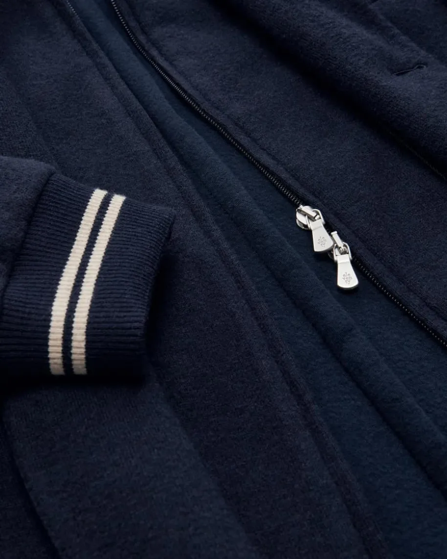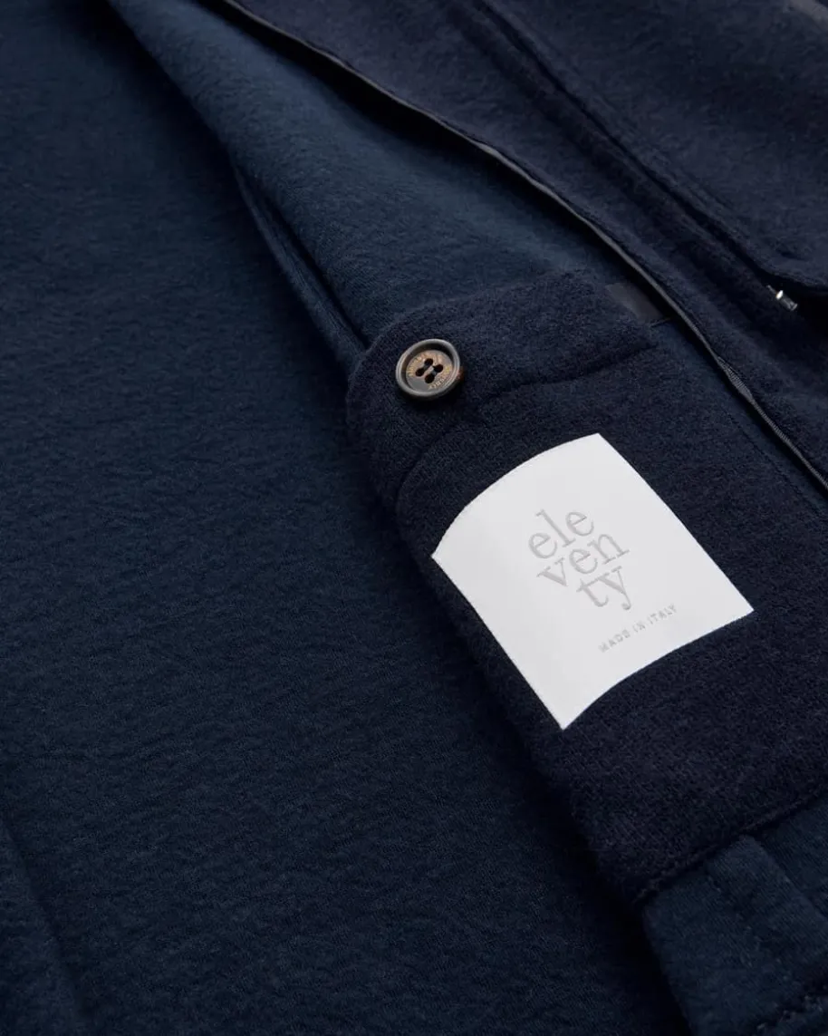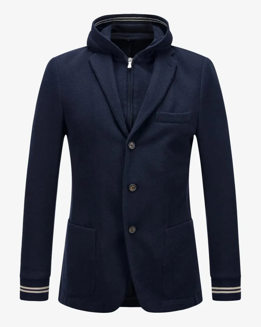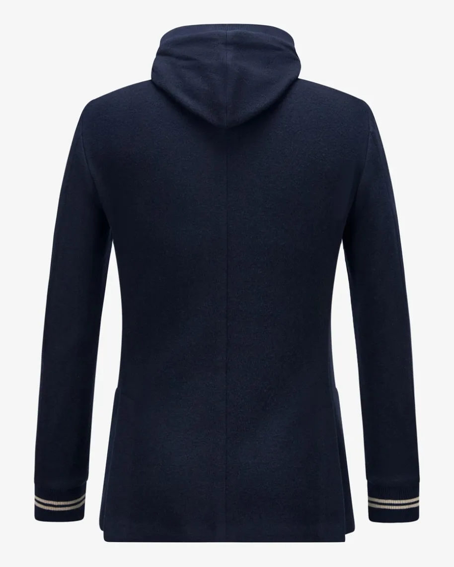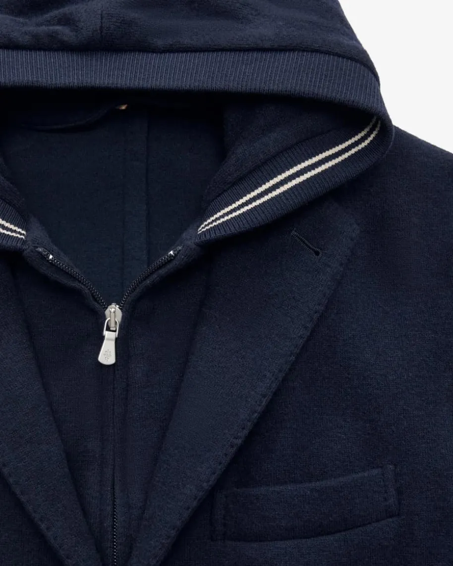 Hybrid-Stricksakko für Herren von Eleventy in Navy. Während das praktischeHybrid-Design mit heraustrennbarer Blende mit Kapuze einen modernen Casual-Begleiter für stilsichere Looks kreiert, fügen die gestreiften Rippstrick-Details einen sportiven Akzent hinzu. Der weiche Baumwolle-Cashmere-Mix sorgtfür angenehmen Tragekomfort und rundet den maskulinen Style harmonisch ab.