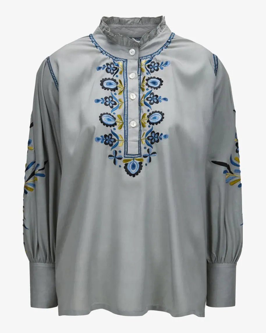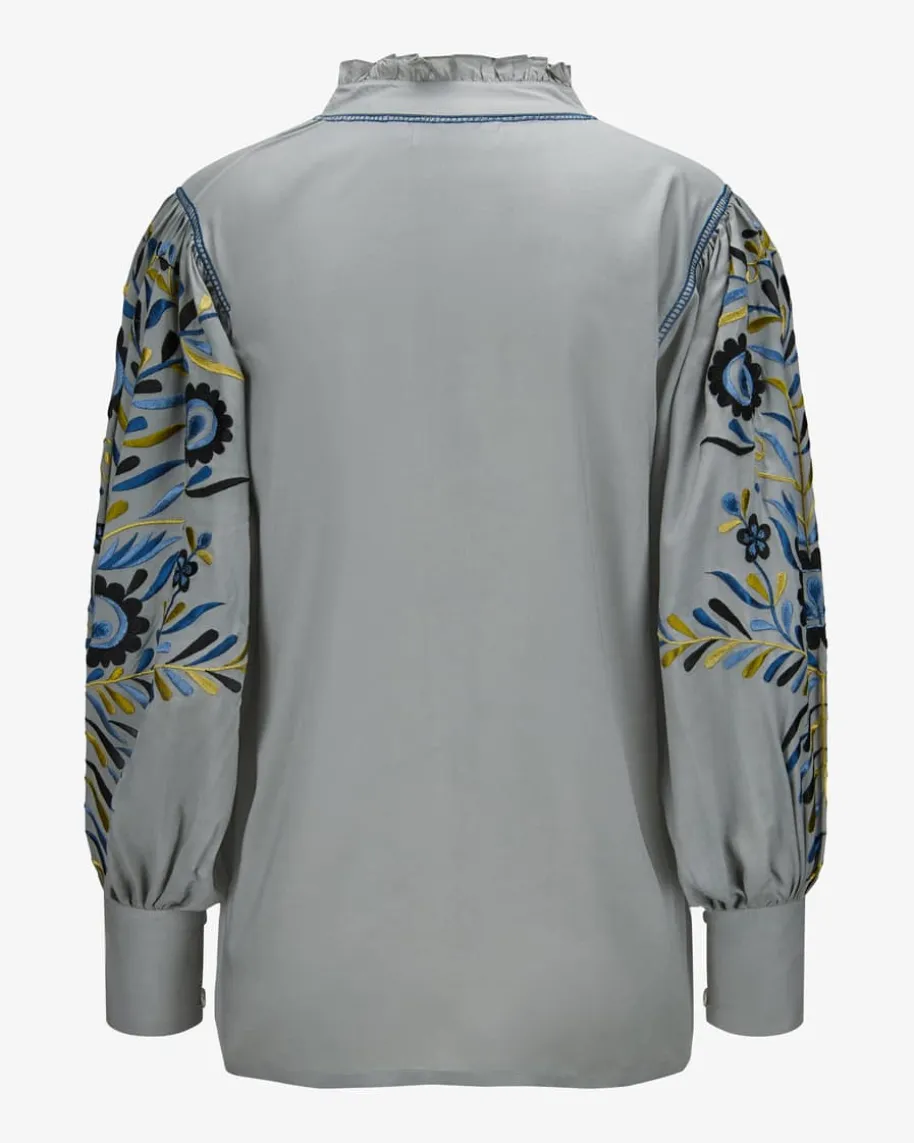 Icon Nr. 10 Blusenshirt für Damen von Style Icon in Blaugrau. Das Modellpräsentiertsichdank des floralen Stickmusters sowie Raffungen am Kragen als modischer Favoritmit Charme. Zudem besticht die fließende Material-Qualität mit einem besondersangenehmen Griff.
