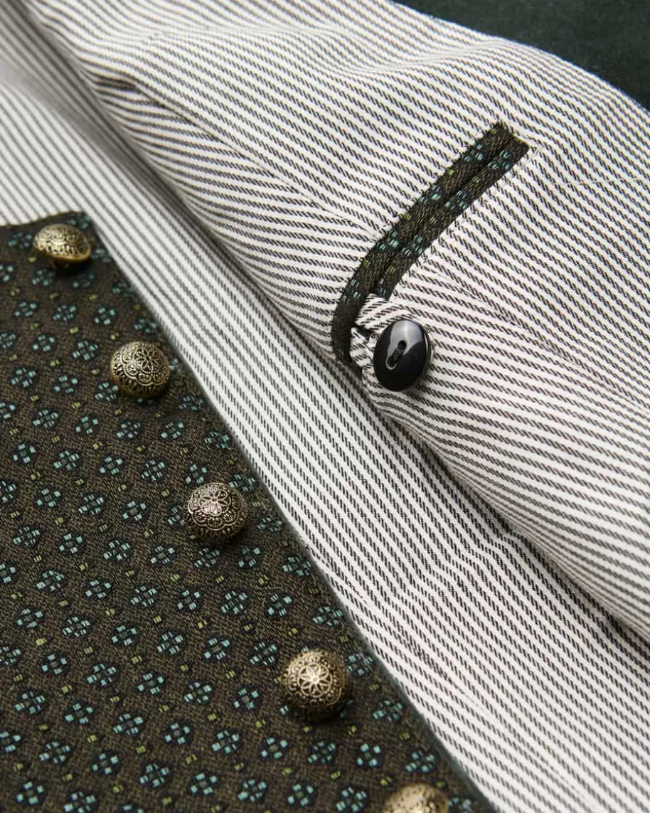 Ignaz Trachtenweste für Herren von Gottseidank in Bronzegrün, Türkis undSchwarz. Das edle Modell besticht durch die traditionelle Aufmachung mit Ketten-Detail, welche dank verzierter Kugelknöpfe und Samt-Paspeln stilvollunterstrichen wird. Zugleich setzt das strukturierte vorderseitige Muster denTrachten-Look modern in Szene.