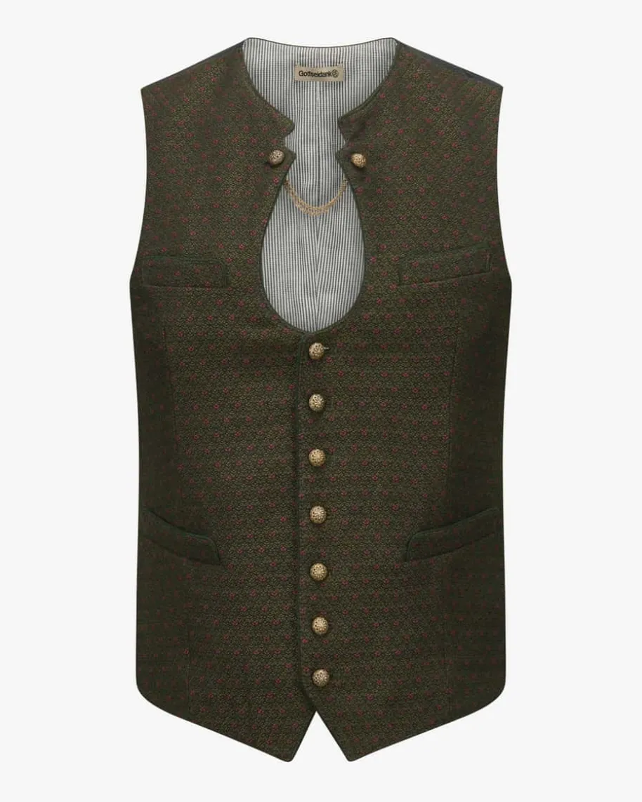 Ignaz Trachtenweste für Herren von Gottseidank in Oliv, Schwarz und Himbeere.Das Trachten-Modell begeistert mit angenehmer Leinen-/Schurwoll-Qualität intraditioneller Optik, welche durch filigran gemusterte Kugelknöpfe sowie derMiesbacher-Aufmachung mit Ketten-Applikation harmonisch untermalt wird. Daszarte Blumenmuster rundet den Look zusammen mit dem Jacquard-Rückenteil imPaisley-Design modisch ab.