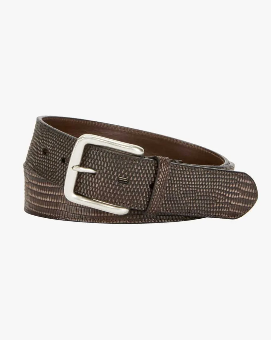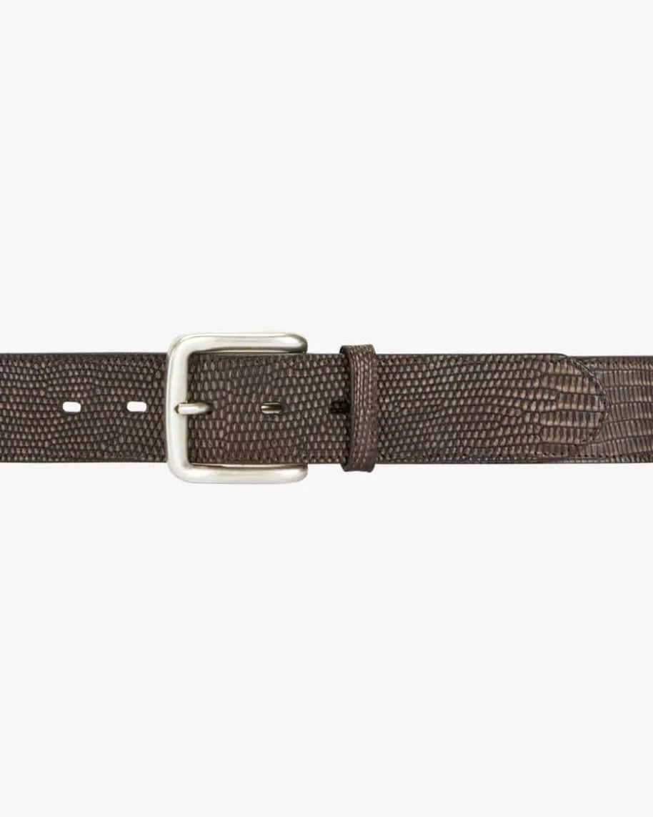 Iguana Old Ledergürtel für Herren von Fausto Colato in Dunkelbraun. Das Modellüberzeugt mit edlem Leguan-Leder und genoppter Struktur. Die markantesilberfarbene Dornschließe rundet das maskuline Design gekonnt ab.