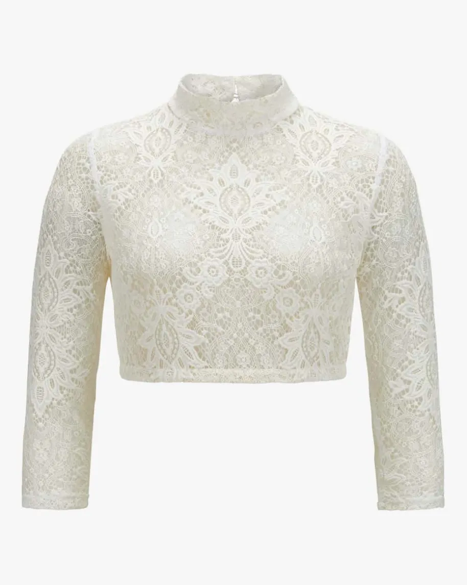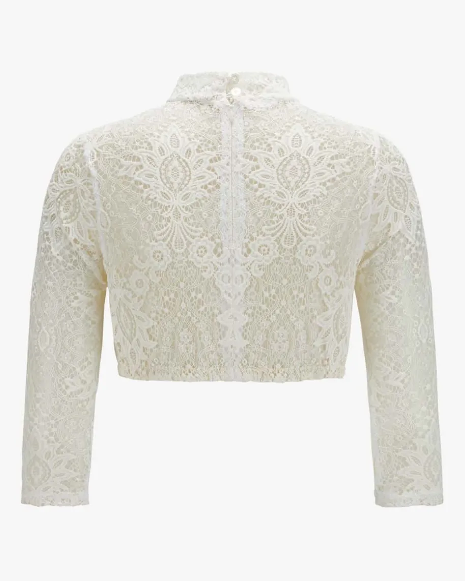 Inga Dirndlbluse für Damen von Kinga Mathe in Weiß. Das hochgeschlossene Modellbesticht durch das semitransparente Häkel-Dessin und avanciert so zum femininenDirndlbegleiter.