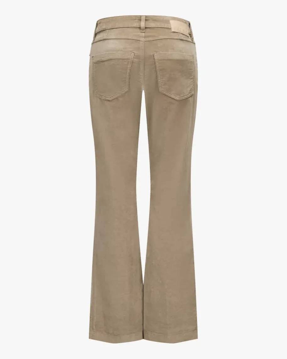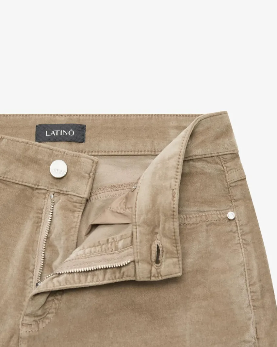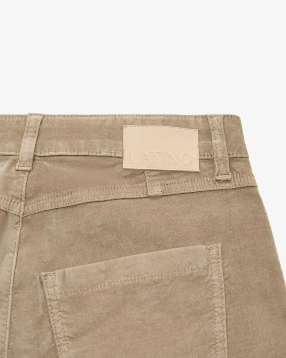 Iris Samthose für Damen von Latino in Sand. Das Modell besticht dank dem dezentausgestellten Bein mit optimaler Passform, während die Samt-Qualität zusammenmit den labeltypischen Logo-Details optische wie auch haptische Highlightssetzt.