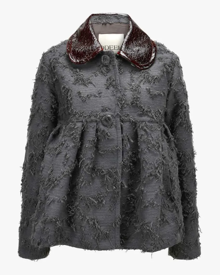 Jacke für Damen von Odeeh in Grau und Mahagoni. Das Modell in modischerJacquard- Aufmachung präsentiert sich dank markantem Bubikragen in Lackleder-Optik sowie Fransen- Details als moderner Dark Romance-Favorit, welcher dank demSchößchen einen femininen Twist mit Babydoll-Charakter erhält.
