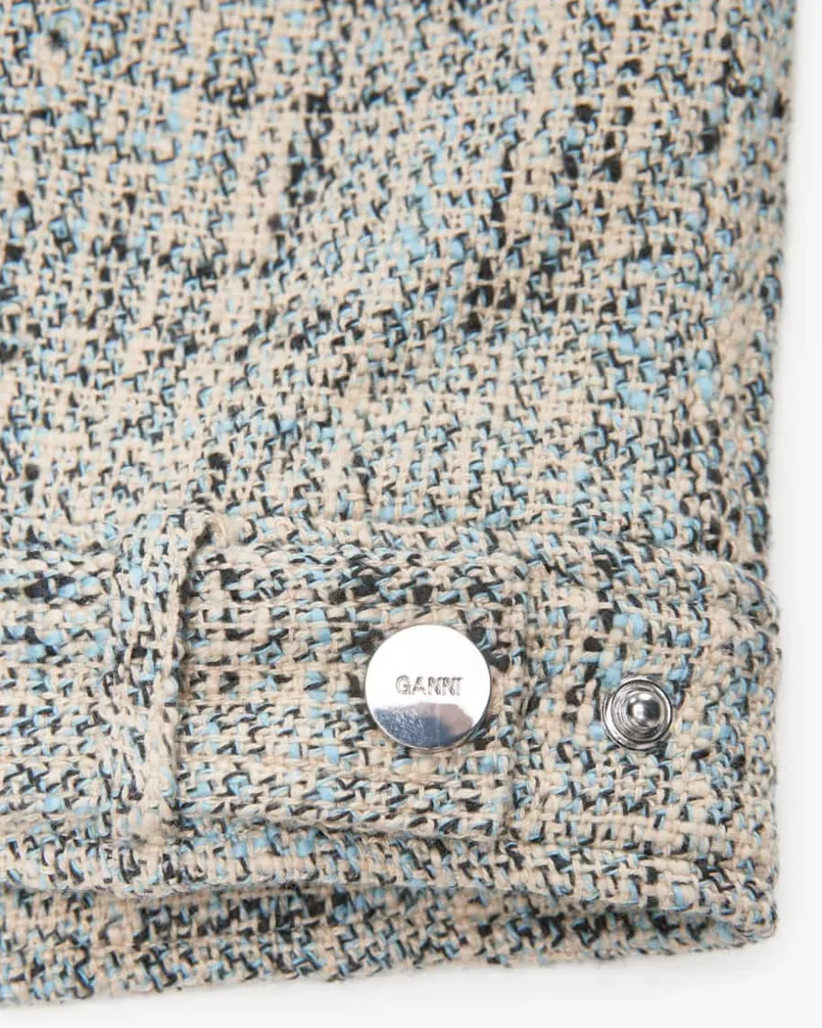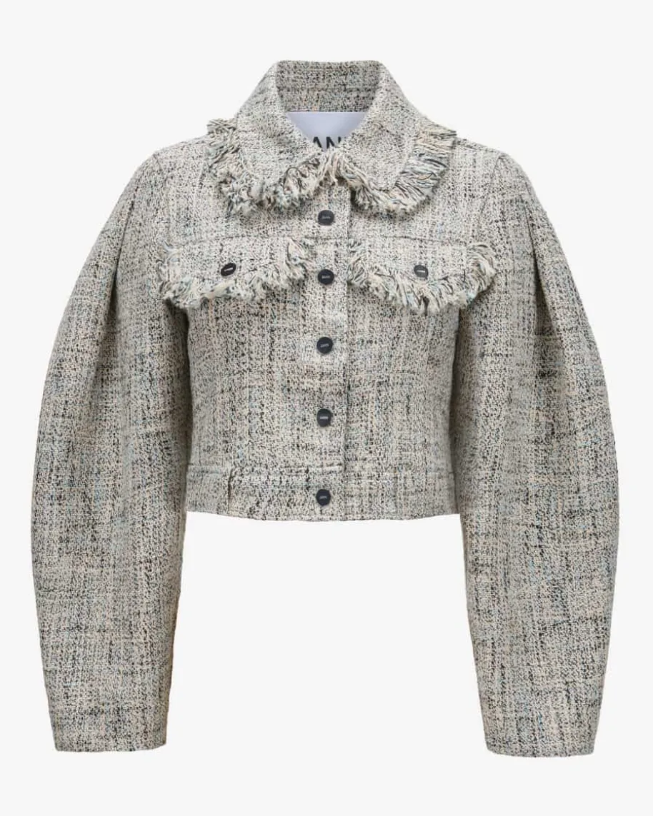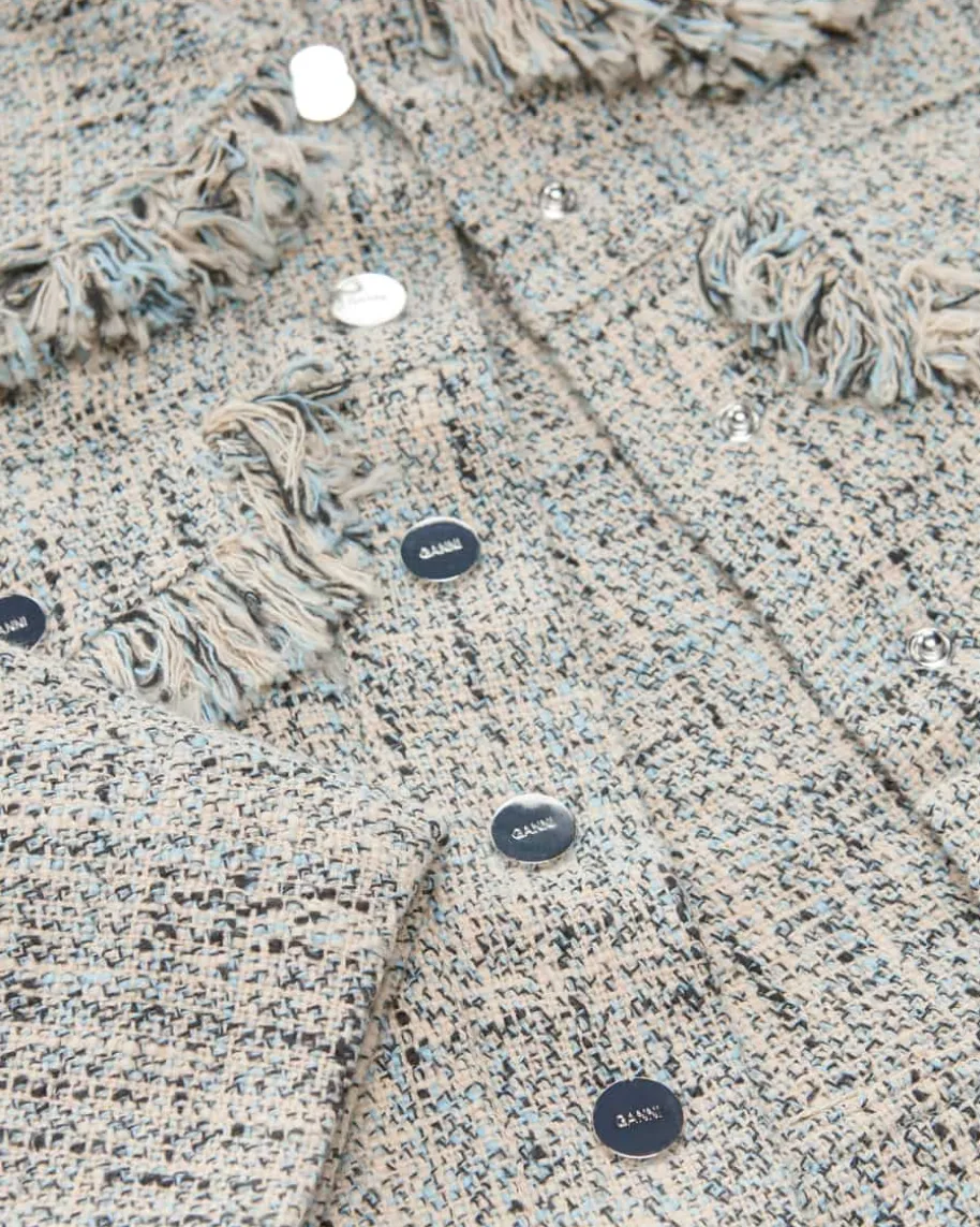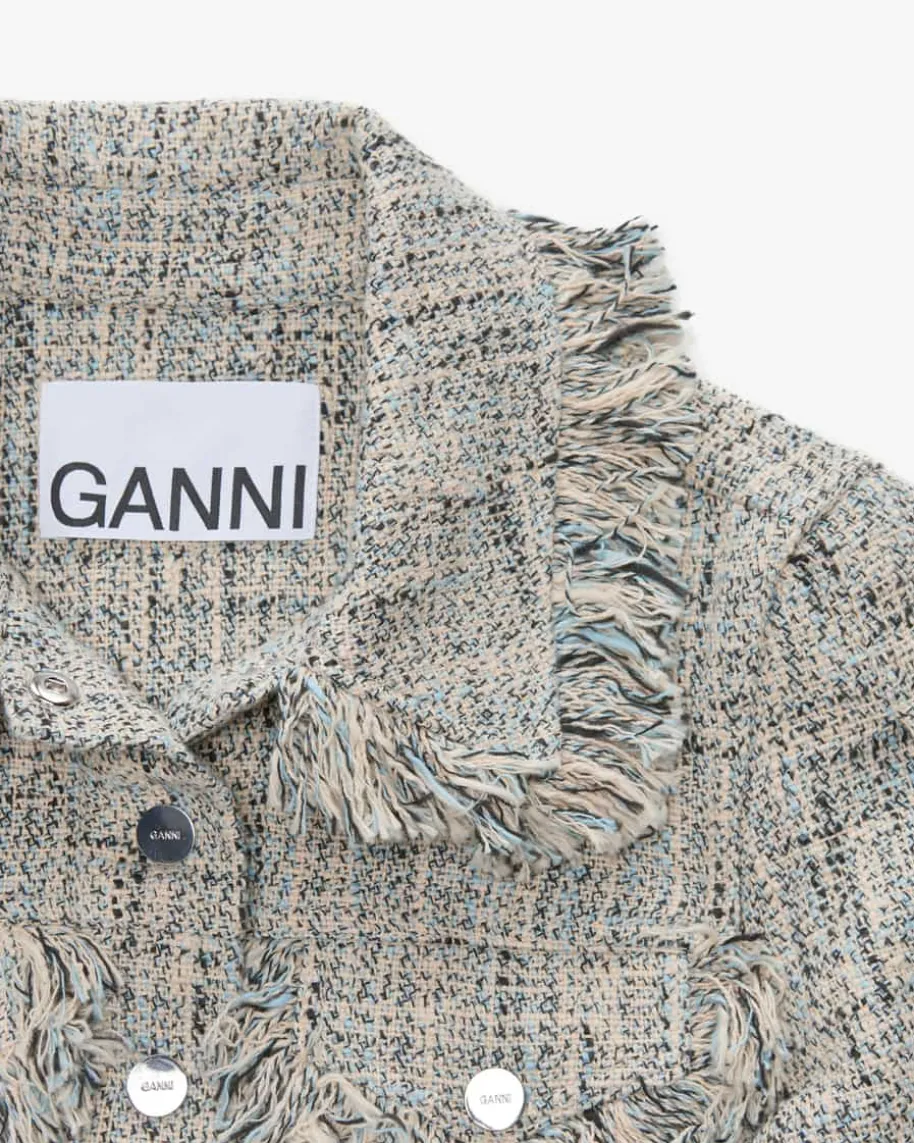 Jacke für Damen von Ganni in Hellblau, Sand und Schwarz. Das Modell überzeugtmit typischer Tweed-Optik aus hochwertiger Bio-Baumwolle und kreativen Fransen-Details als modischer Casual-Begleiter, welcher durch die großen Klappentaschenund die verkürzte Silhouette gekonnt in Szene gesetzt wird.