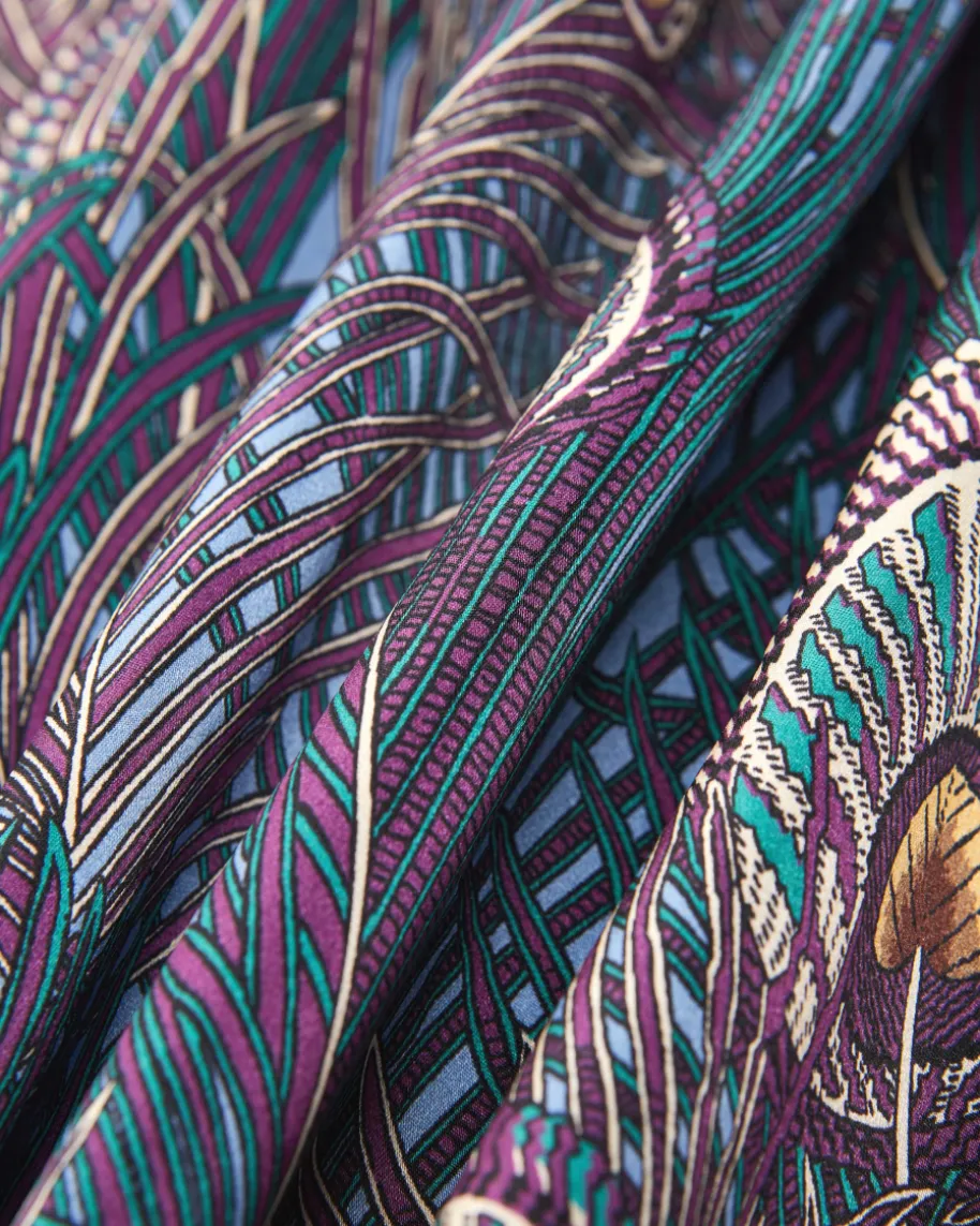Jade Seiden-Kimono für Damen von biscuits. luxury essentialsin Violett, Jade und Blau. Das Münchner Label verbindetluxuriöse Seidenmode mit modernem Lifestyle und einementspannten Lebensgefühl – stilvoll entworfen in München fürselbstbewusste Frauen. Auch diesesModell mit feinem Pfauenfedern-Print überzeugt durch seineleichte, fließende Qualität, die ein angenehmes Tragegefühlgarantiert und zugleich eine elegante Silhouette schafft. Obals stilvolle Loungewear oder luxuriöse Nachtwäsche – dasextravagante Modell ist vielseitig tragbar, auch inKombination mit der passenden Hose.