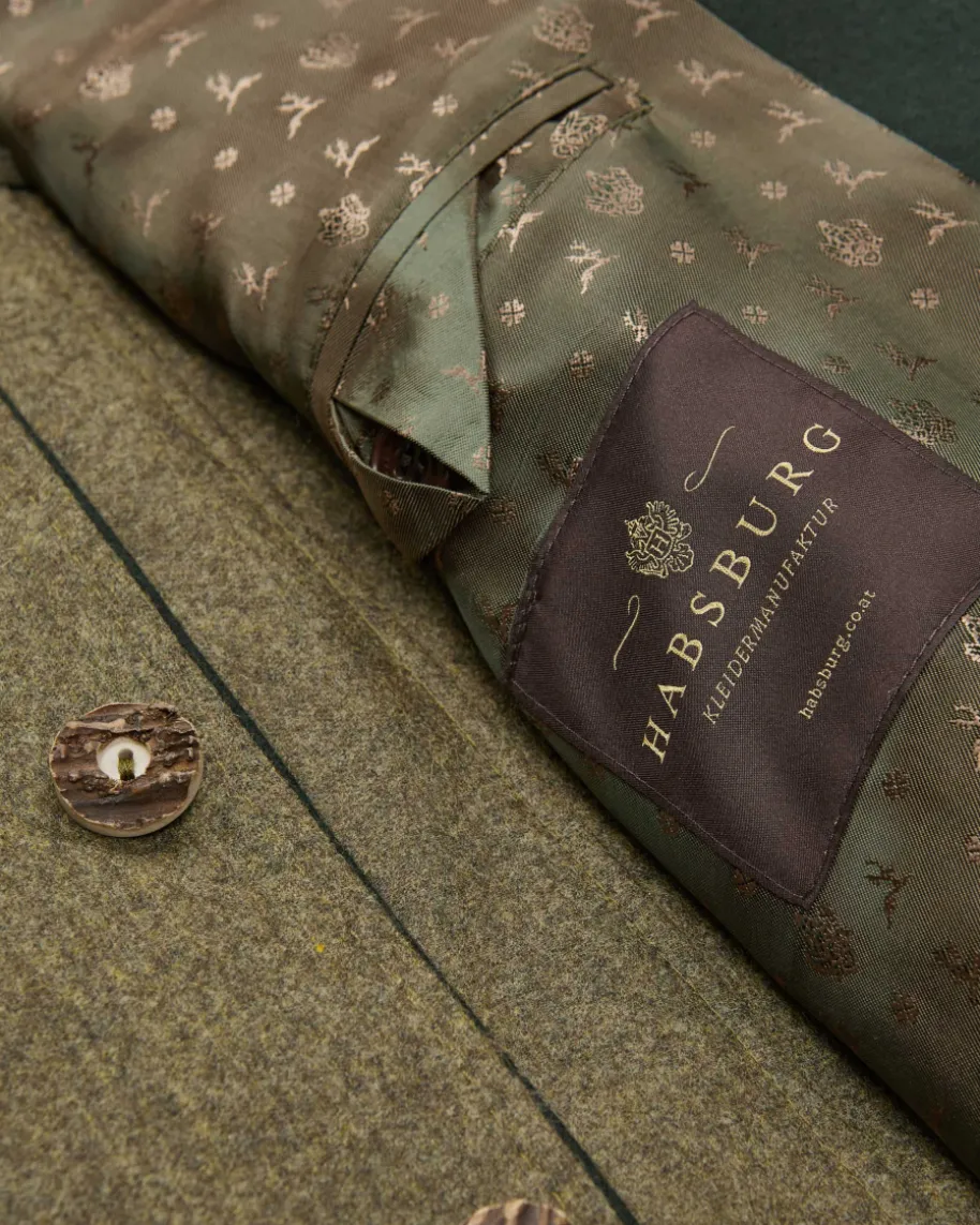 Jakob Trachtenjanker für Herren von Habsburg in Oliv. Das Modell inantaillierter Passform und traditionellem Charakter erweist sich als idealerBegleiter für stilvolle Trachten-Looks, während rustikale Hornknöpfe dasGesamtbild gekonnt vollenden.