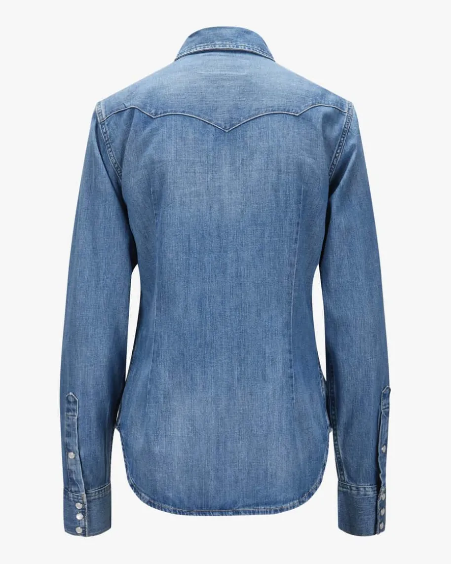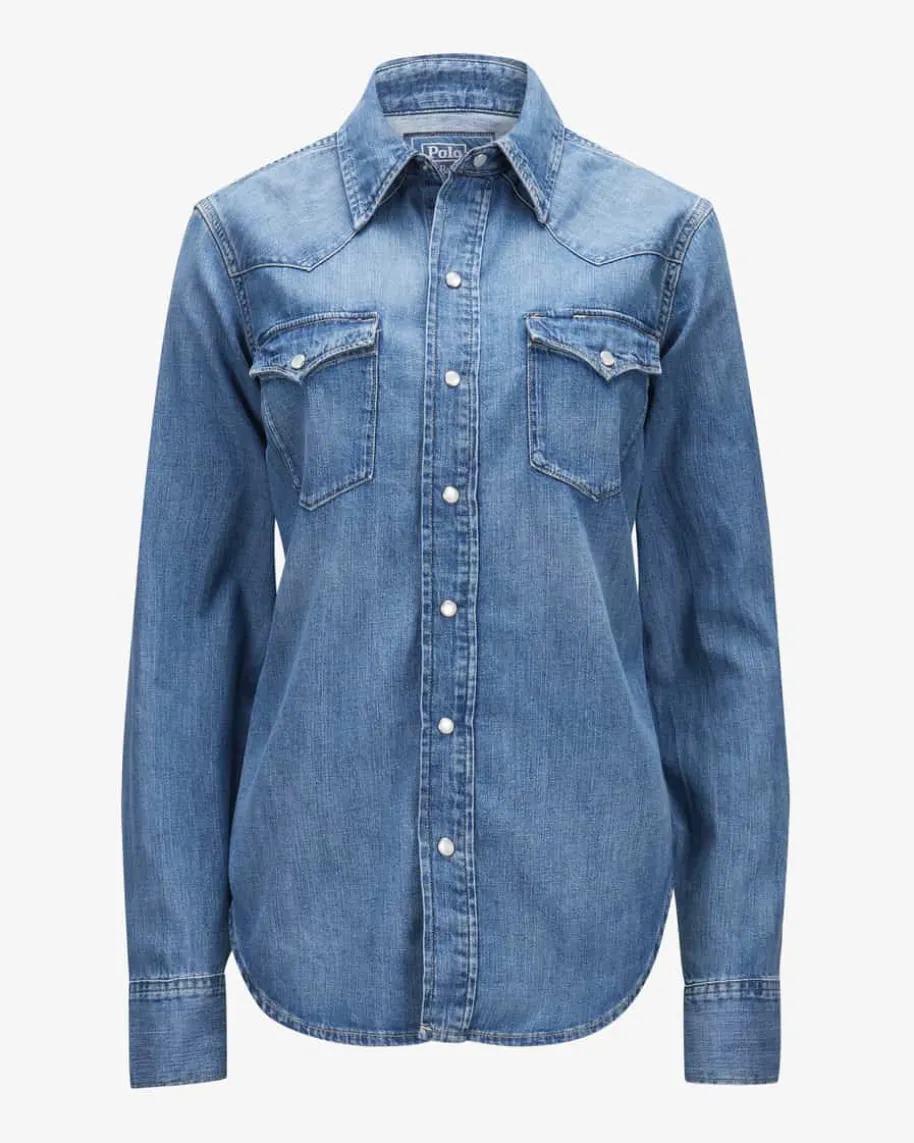 Jeansbluse für Damen von Polo Ralph Lauren in Blau. Das Modell aus angenehmerBaumwoll-Qualität präsentiert sich als modischer Denim-Favorit, der durch denabgerundeten Saum und legeren Washed Look einen modernen Touch erhält. DieDetails im Western-Stil runden das Design gekonnt ab.