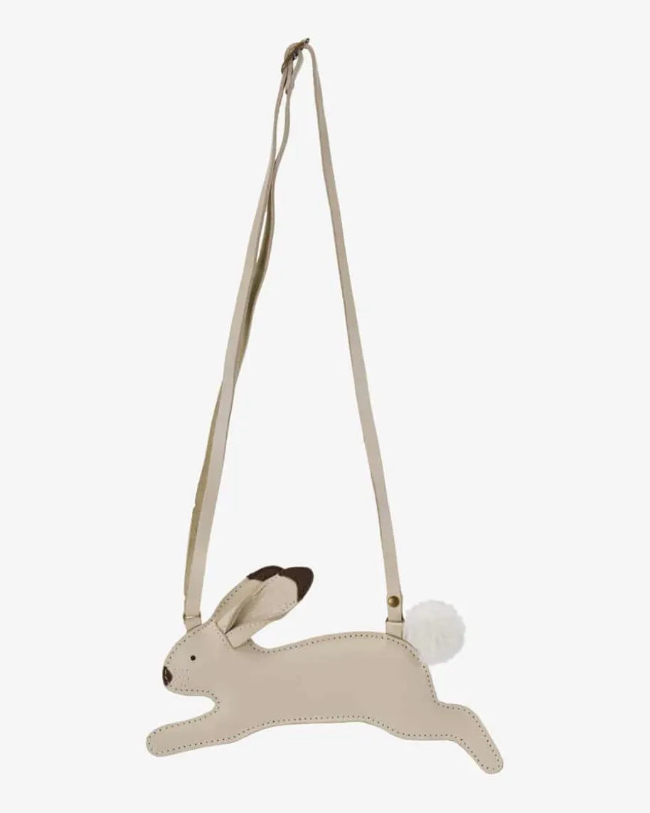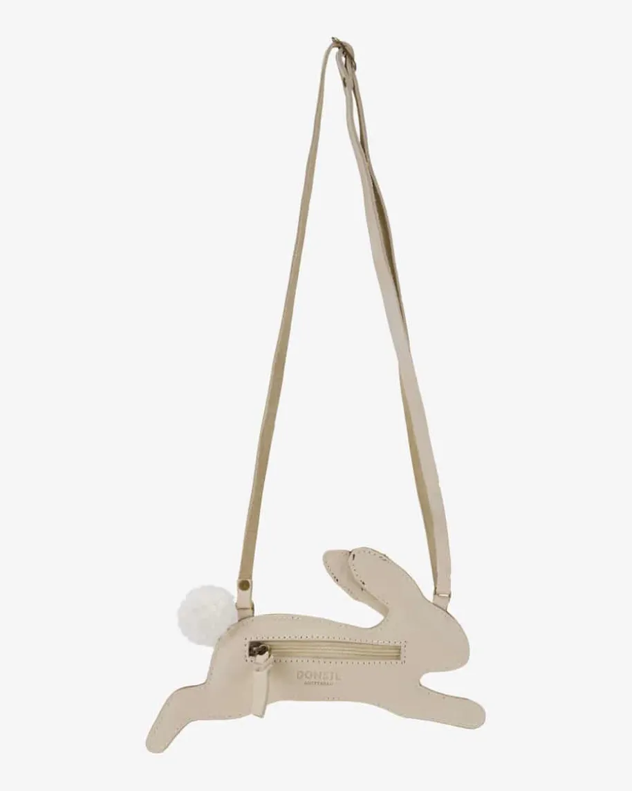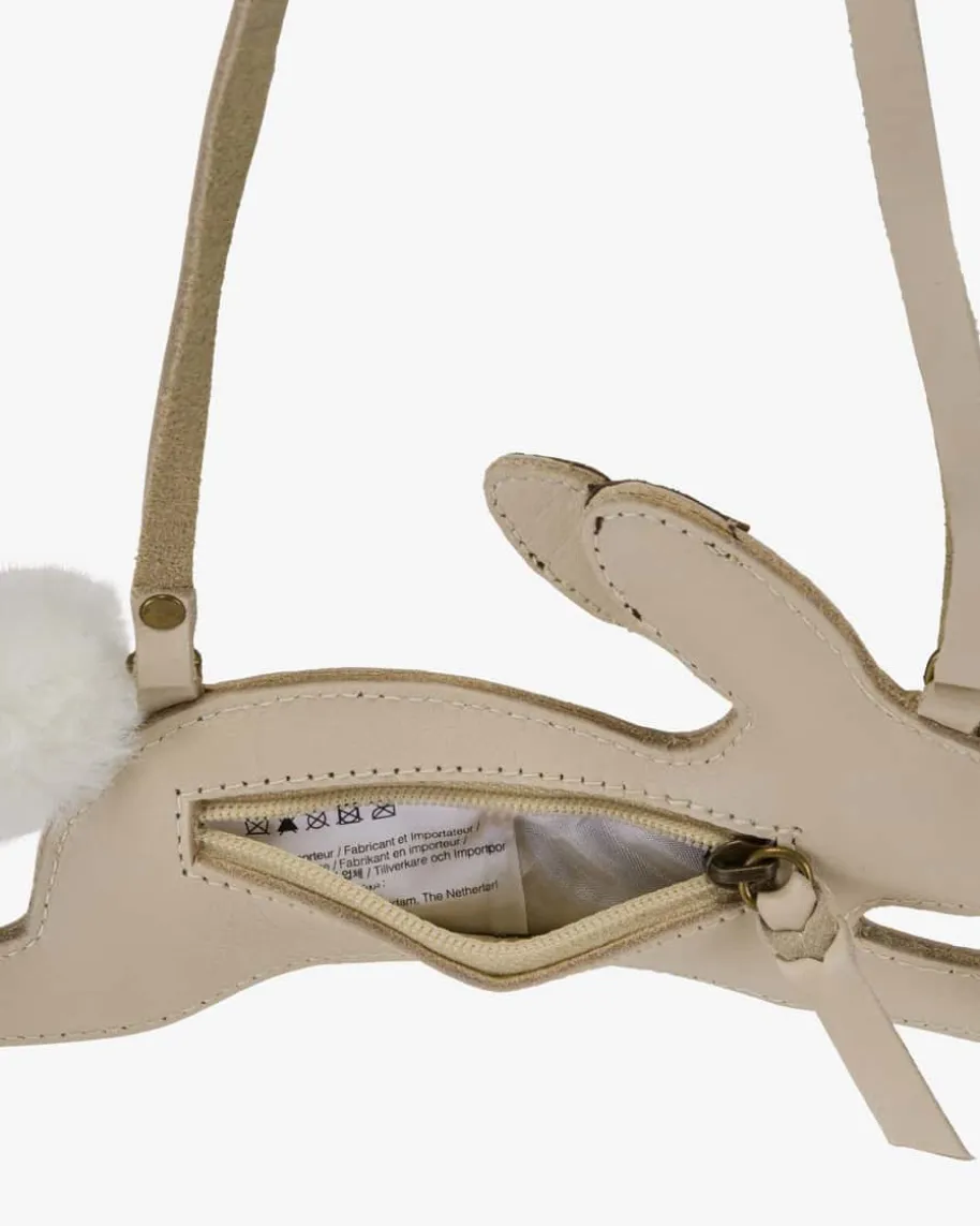 Jimp Umhängetasche für Mädchen von Donsje in Creme. Fantasievolle Designs, dieaus hochwertigen Materialien in Handarbeit gefertigt werden, zeichnen das Labelaus. Auch diese süße Tasche punktet mit dem niedlichen Häschen-Design und dientals praktische Geldbörse sowie zur Aufbewahrung für andere kleine Schätze.